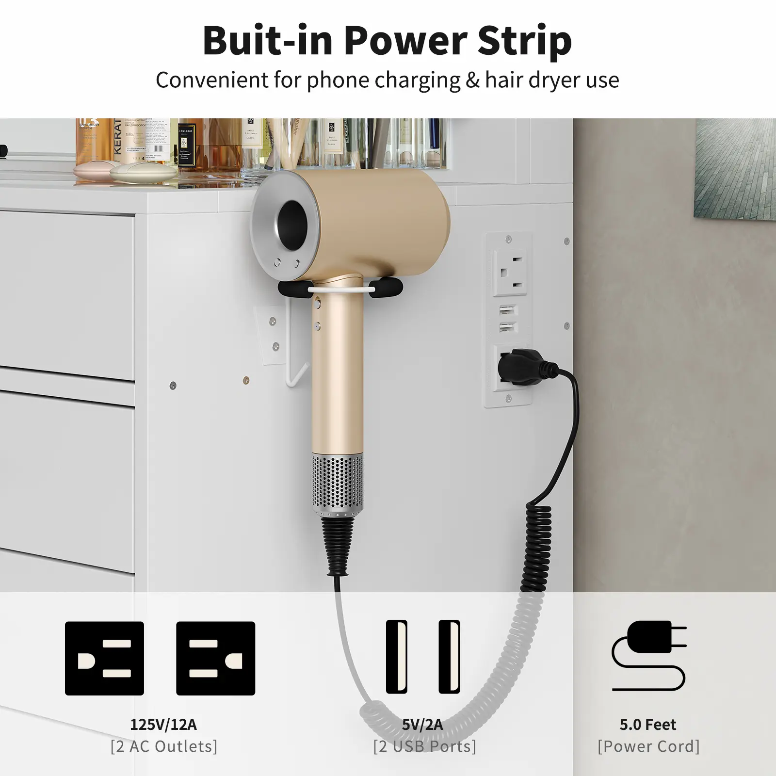 Come with Charging Station: This makeup vanity is with a hair dryer stand and power outlet. The power outlet includes 2 standard plug sockets and 2 USB ports to connect your hair dryer, curling iron, computer, cell phone, ipad and other devices