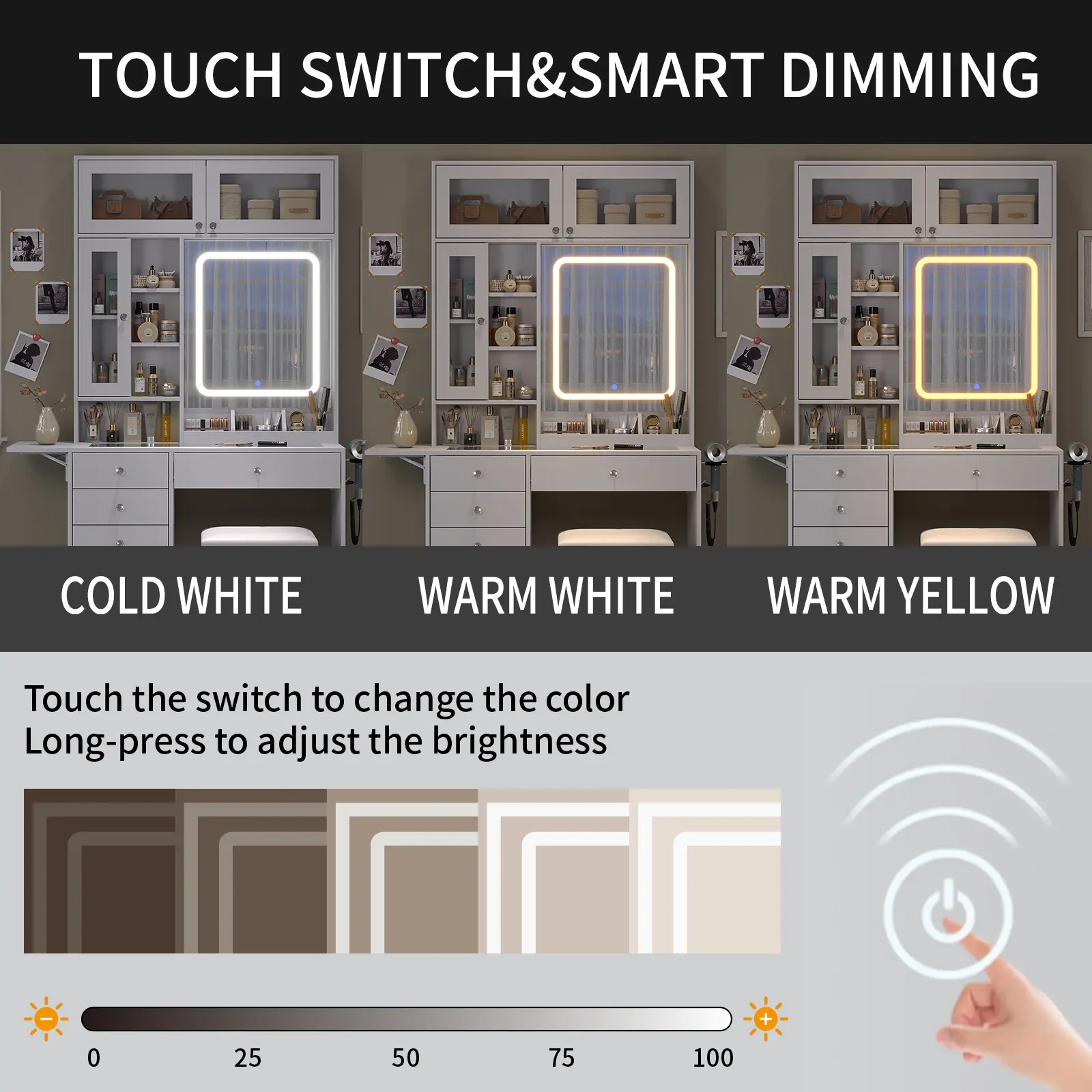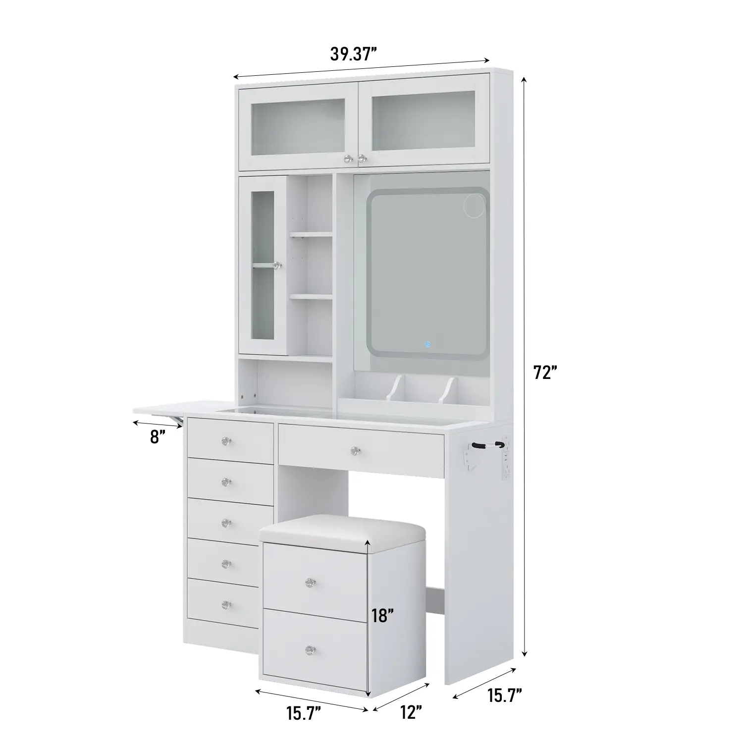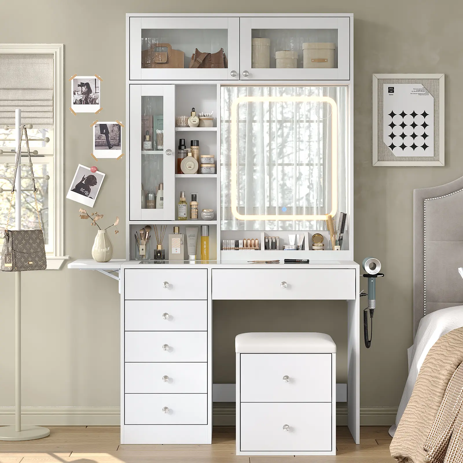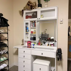 ·Spacious & Adjustable Tabletop with Glass Surface: Need more workspace? The expandable & foldable tabletop adapts to your routine. The tempered glass surface adds a modern touch while providing a clear view of your cosmetics and jewelry—combining style with functionality.