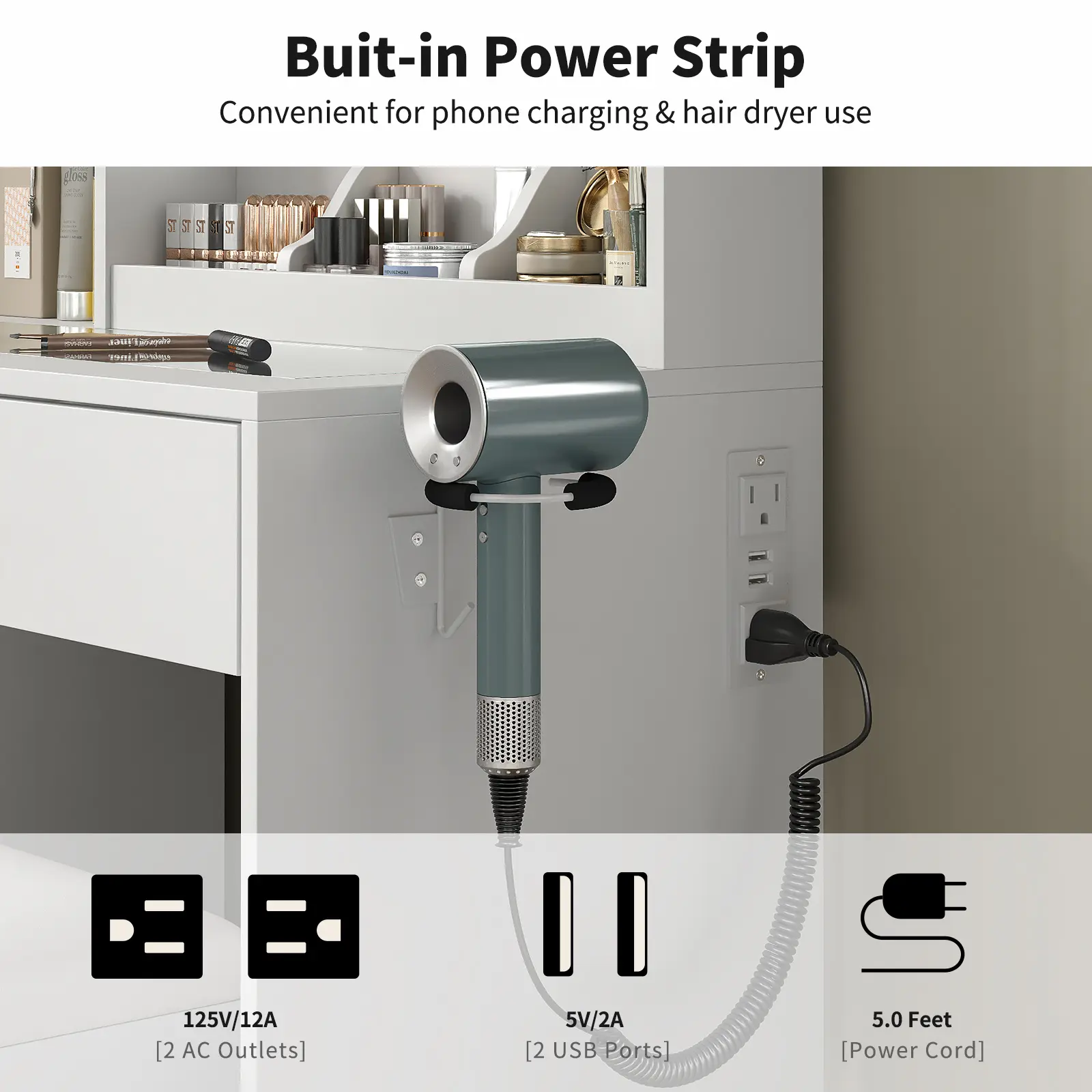 ·Charging Station & Holder: This makeup vanity desk with lights is designed with a hair dryer holder and a charging station that includes two AC outlets and two USB ports, which makes it easier to connect your hair dryer, and curling iron or other mobile devices, and ensures you have a seamless and efficient beauty routine every day.