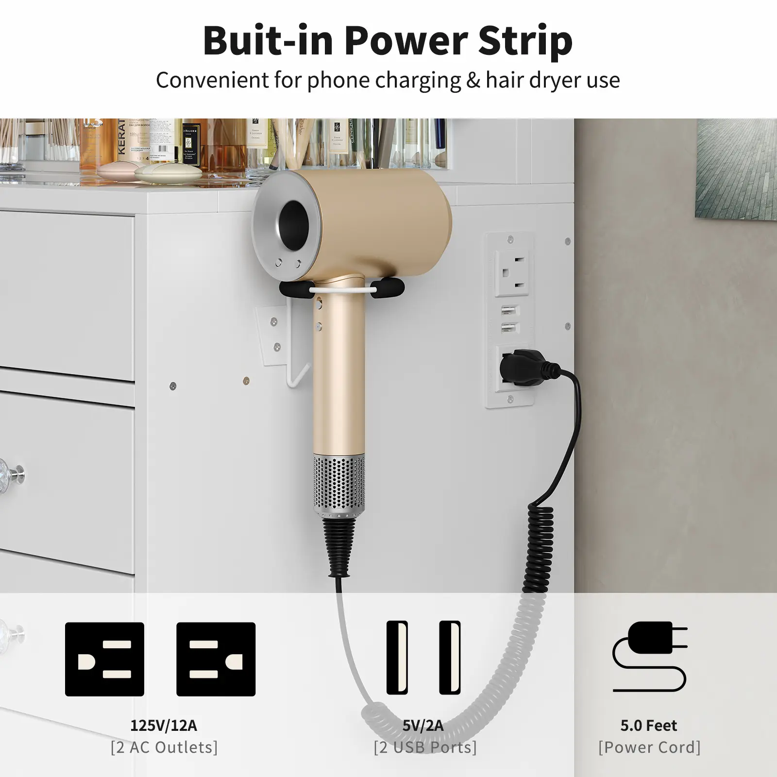 Come with Charging Station: This makeup vanity is with a hair dryer stand and power outlet. The power outlet includes 2 standard plug sockets and 2 USB ports to connect your hair dryer, curling iron, computer, cell phone, ipad and other devices