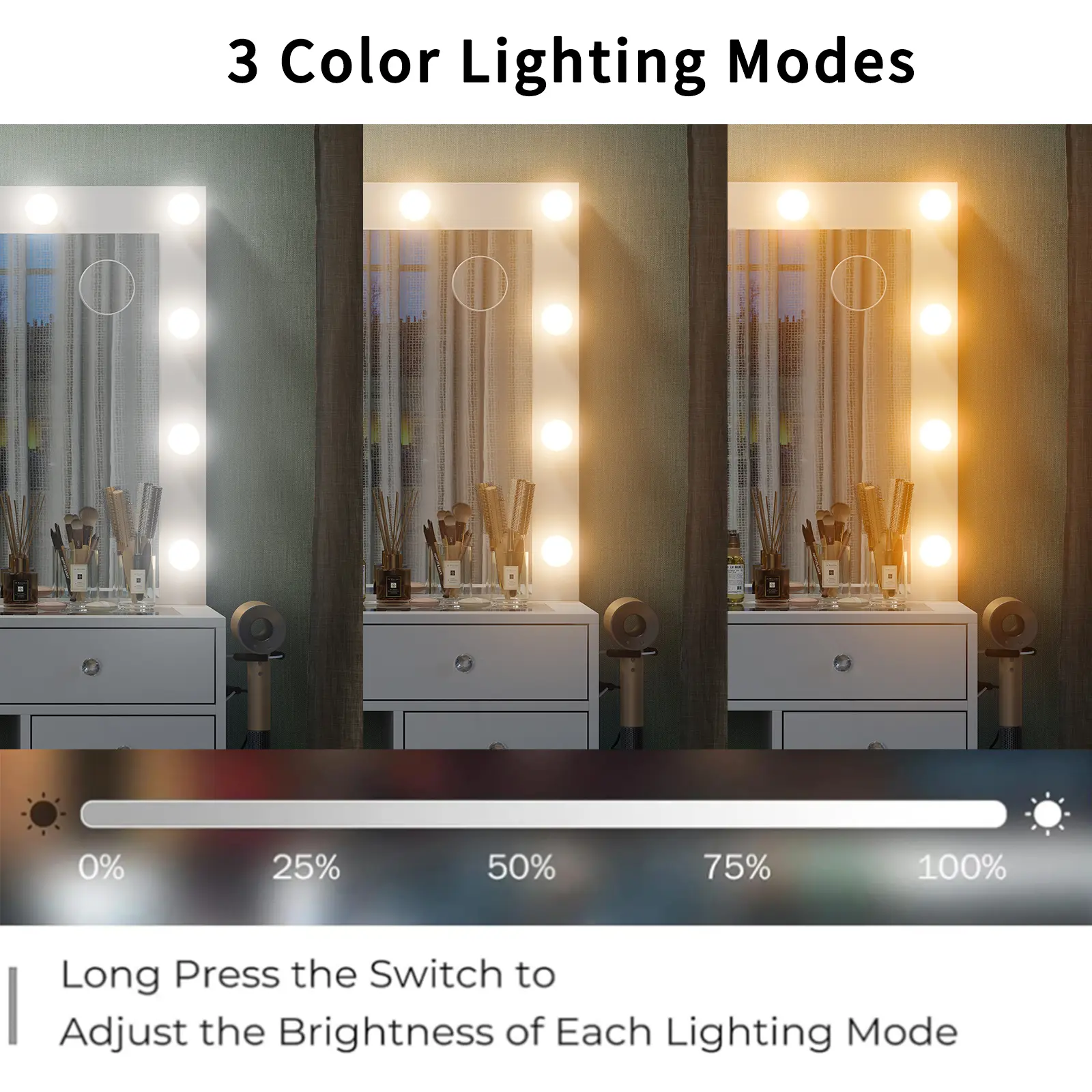 Fantancy Lighting Modes: There are 12 Hollywood light bulbs surround the large mirror to make sure you get a wonderful makeup. Provide with 3 adjustable lighting modes: cold light, natural light and warm light, long pressing the switch can change lighting color. This vanity desk will be your best makeup companion, suitable for bedroom, dressing room, live broadcast, vlog shooting