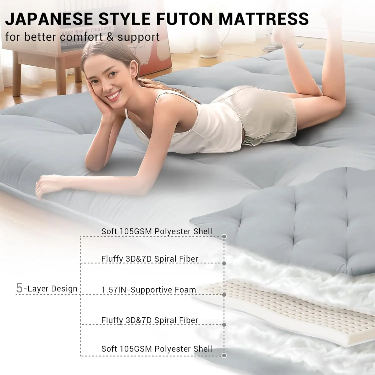 ·5-Layer Futon Mattress Structure: Made of two layers of fluffy cotton fiber with 1.57 Inch high-density supportive foam at the core, you will feel soft and comfortable while sitting and sleeping. Soft premium polyester cover with elegantly quilted pattern, this floor mattress will suitable for your home style and simplify your life.