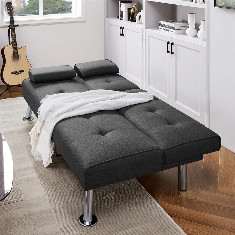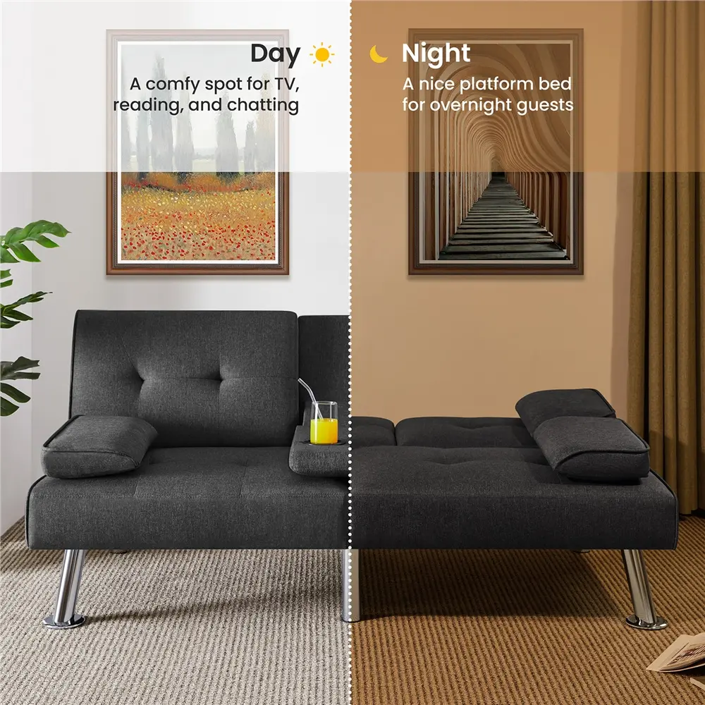 This 3-in-1 Convertible Futon Sofa Bed features an adjustable back that can easily lock at three positions (105°, 140°, 180°), transforming from a regular futon to a reclined sofa to a platform bed depending on the moment's needs. Made of Chrome-plated steel legs and an engineered wood frame, this sofa bed features a resilient foam fill and durable polyester upholstery for years of comfort. For even more functions, this convertible sofa bed has a convenient drop-down platform with two cup holders to create a temporary and handy surface for drinks and snacks. Thanks to the transformable structure and compact size, this upholstered sofa bed is perfect for small apartments, studios, RVs, offices, dorms, condos, cramped living rooms, and other limited spaces. Better yet, setting up this futon only takes a few minutes. Just take out all the parts from the zip compartment underneath the sofa bed, fix the four legs, flip the sofa over, and then your new futon is ready to serve!