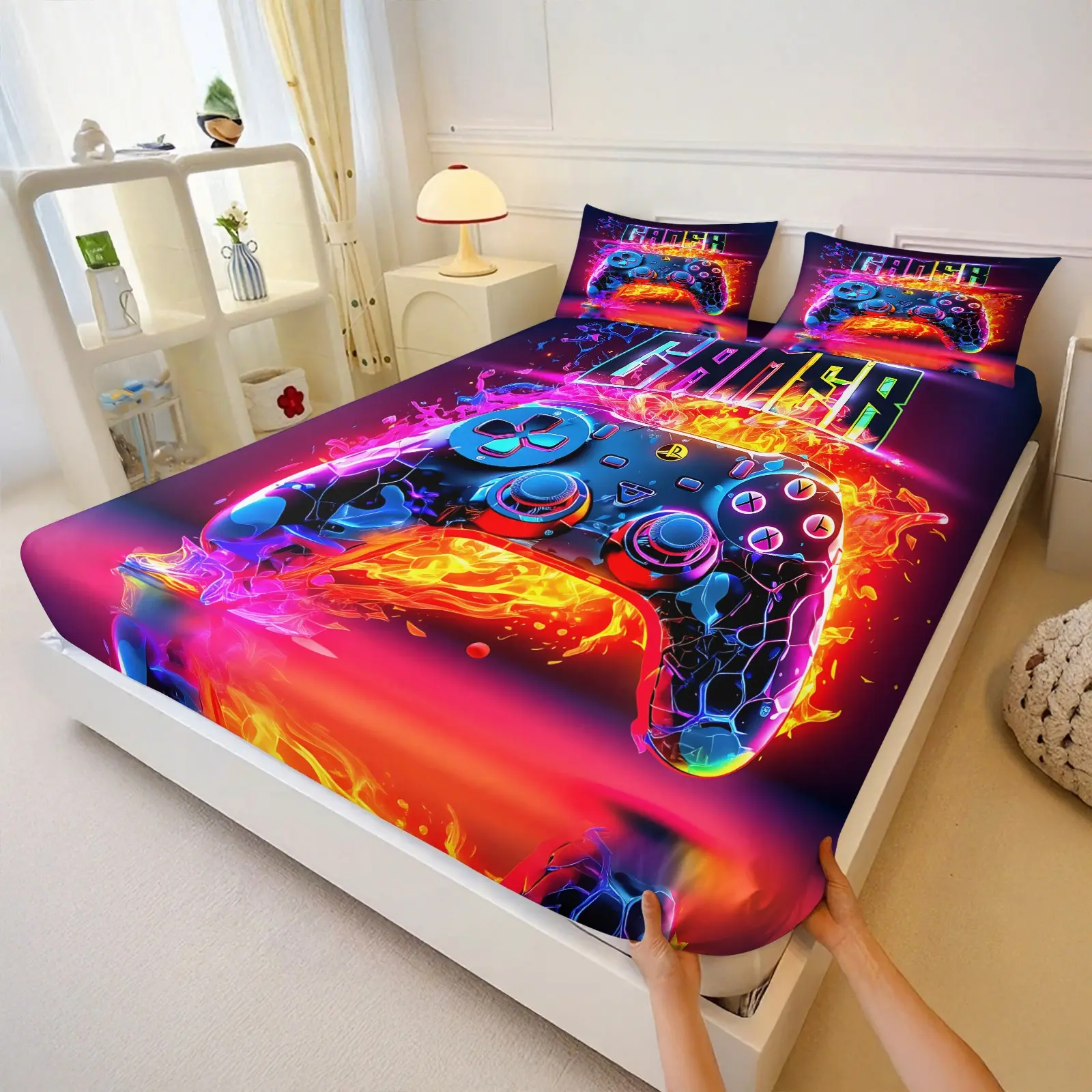 Futuristic, Modern Flair, Energetic Gaming Controller 3pcs Fitted Sheet Set, Flame Neon Effects, Dynamic Vibrant Digital Printed Bedding Set, Comfort Ultra-Fine Fiber Bed Cover, Stylish Energetic Home Decoration, Includes 2 Pillowcases, No Pillow Core