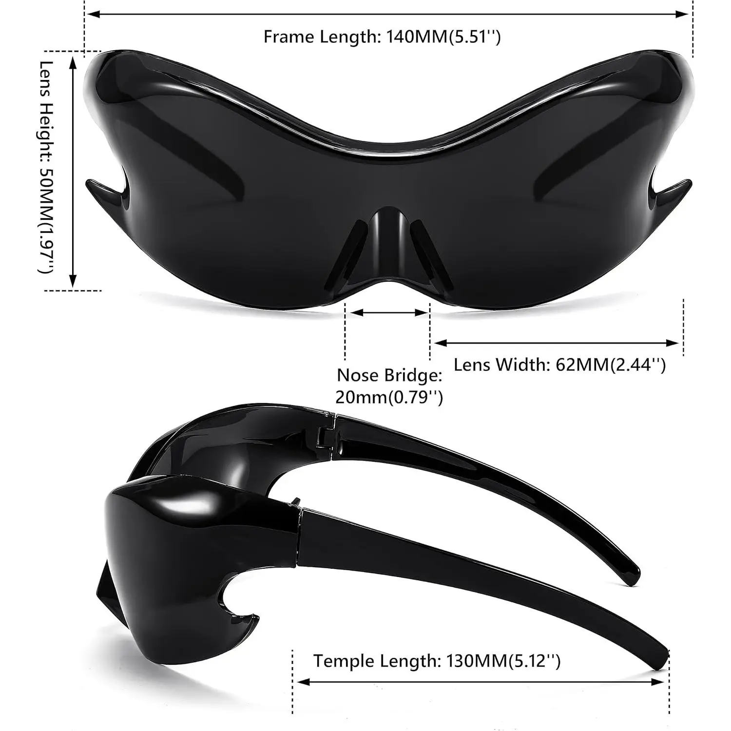 ·[Product Dimensions] The dimensions of the sunglass lens width are 62mm (2.44 inches), frame width is 140mm (5.51 inches), frame height is 50mm (1.97 inches), and nose bridge is 20mm (0.79 inches) respective and the temple Length is 130mm (5.12 inches).