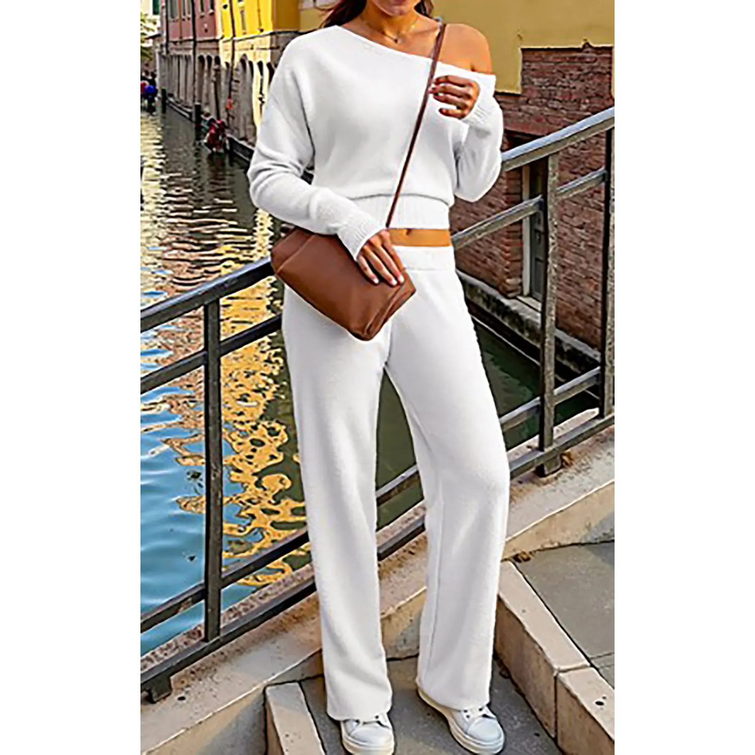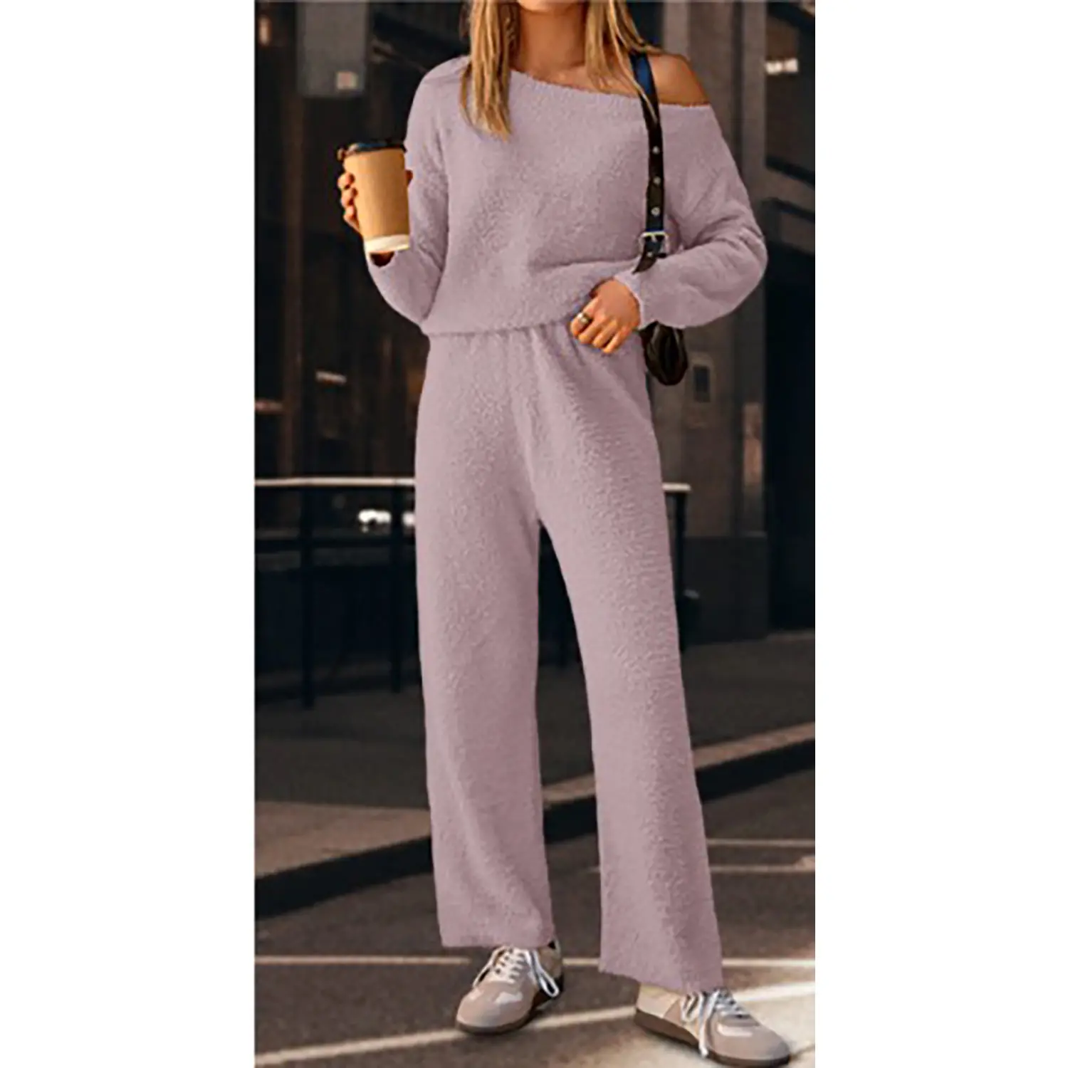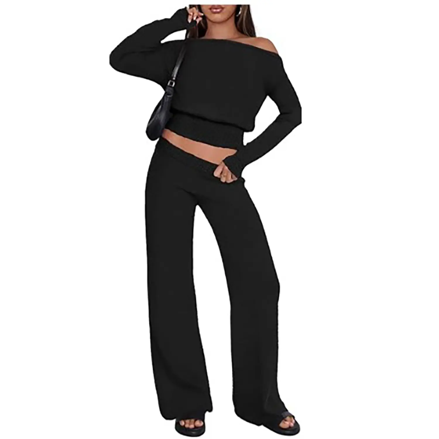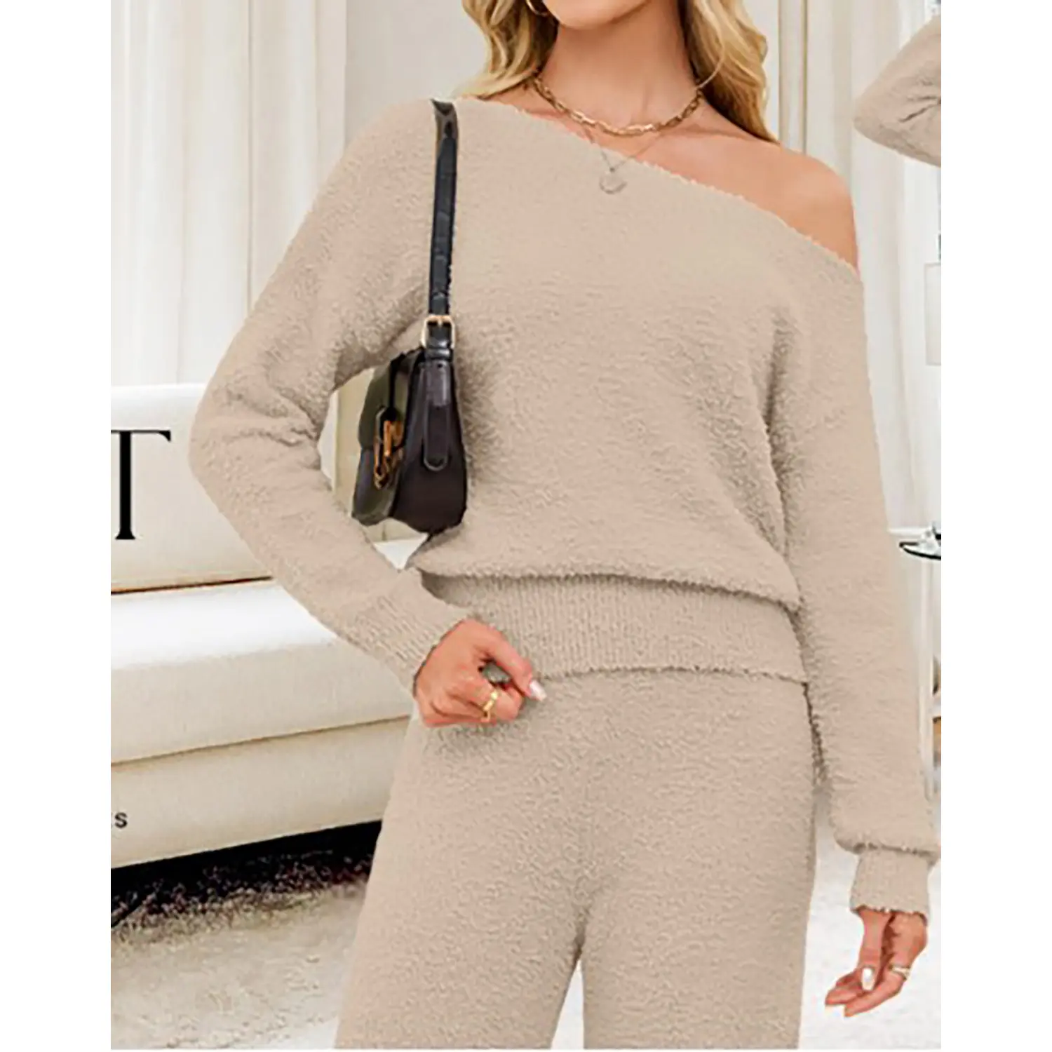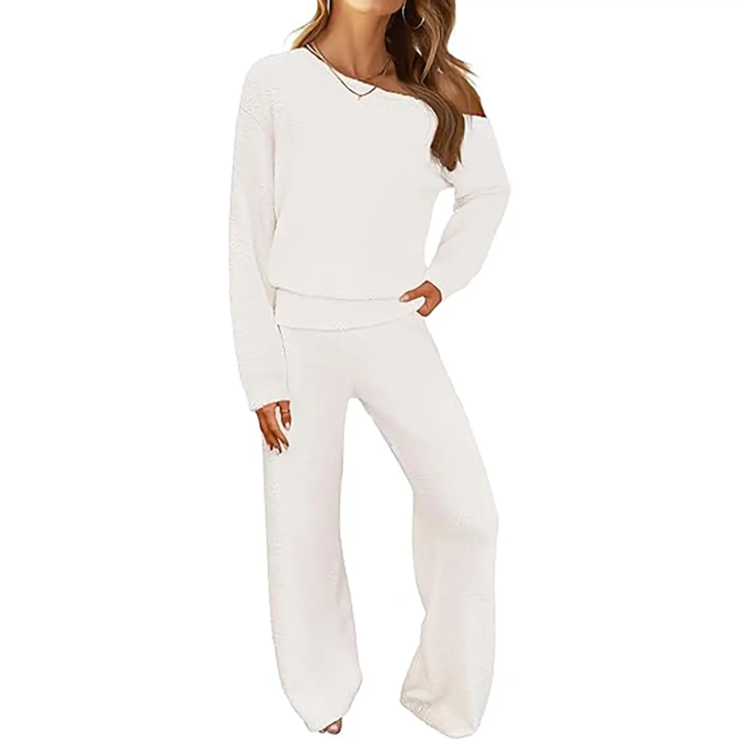 Β·Features: The flattering Lounge sets feature long sleeves, one shoulder design, solid color, elastic hem, wide leg pants, fuzzy fleece fabric, casual and chic style. Matching sets women clothing, winter pajamas, travel airport outfits for women 2025, cute pajama sets for women, knit sets two piece women