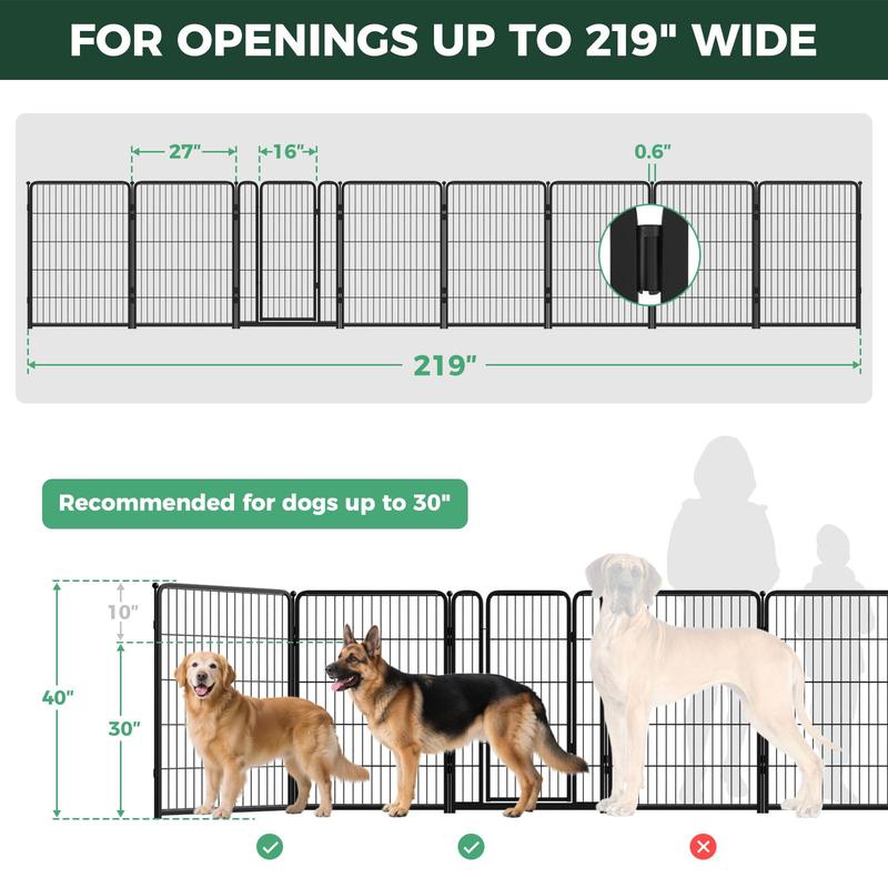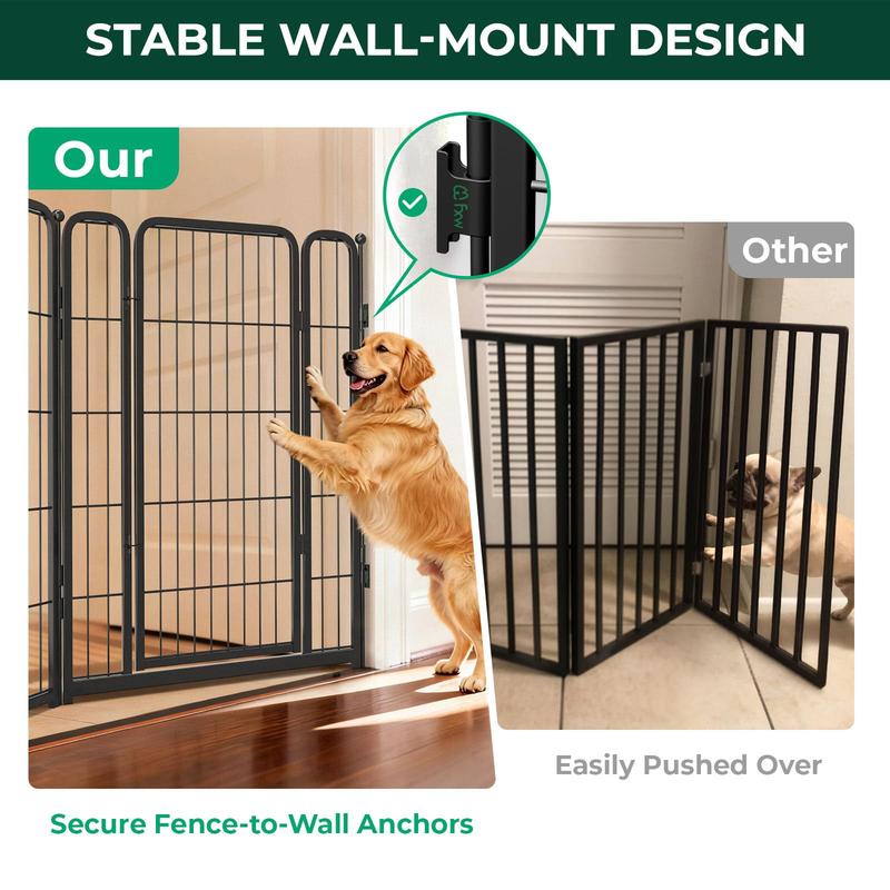 Full-Metal Design with Elegant Aesthetics: The dog gate is made from full-metal material. The accompanying Fence-to-Wall anchors securely fastens the panels to the wall, ensuring a highly stable structure even when set up as a closed-loop play area. Its sleek lines and metallic texture blend seamlessly with a variety of home decor styles, creating a balance of functionality and aesthetics.