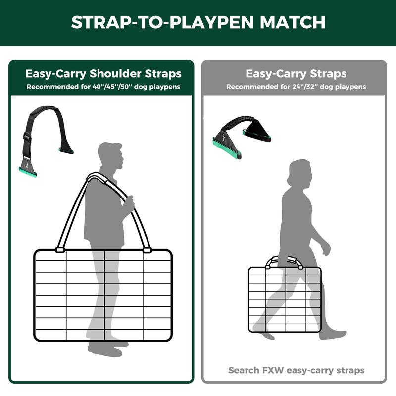·【Playpen Transfer Solution】To meet the unique demands of our FXW community, particularly for those who love RV adventures and often move dog playpens, we've developed the Effort-Save Shoulder Straps. This straps simplifies moving dog playpens from 24 to 50 inches, ensuring smooth transport between your RV and campsite. Tip: If you have a 24'' or 32" dog playpen, our another Easy-Carry Handy Straps maybe a more budget-friendly choice.