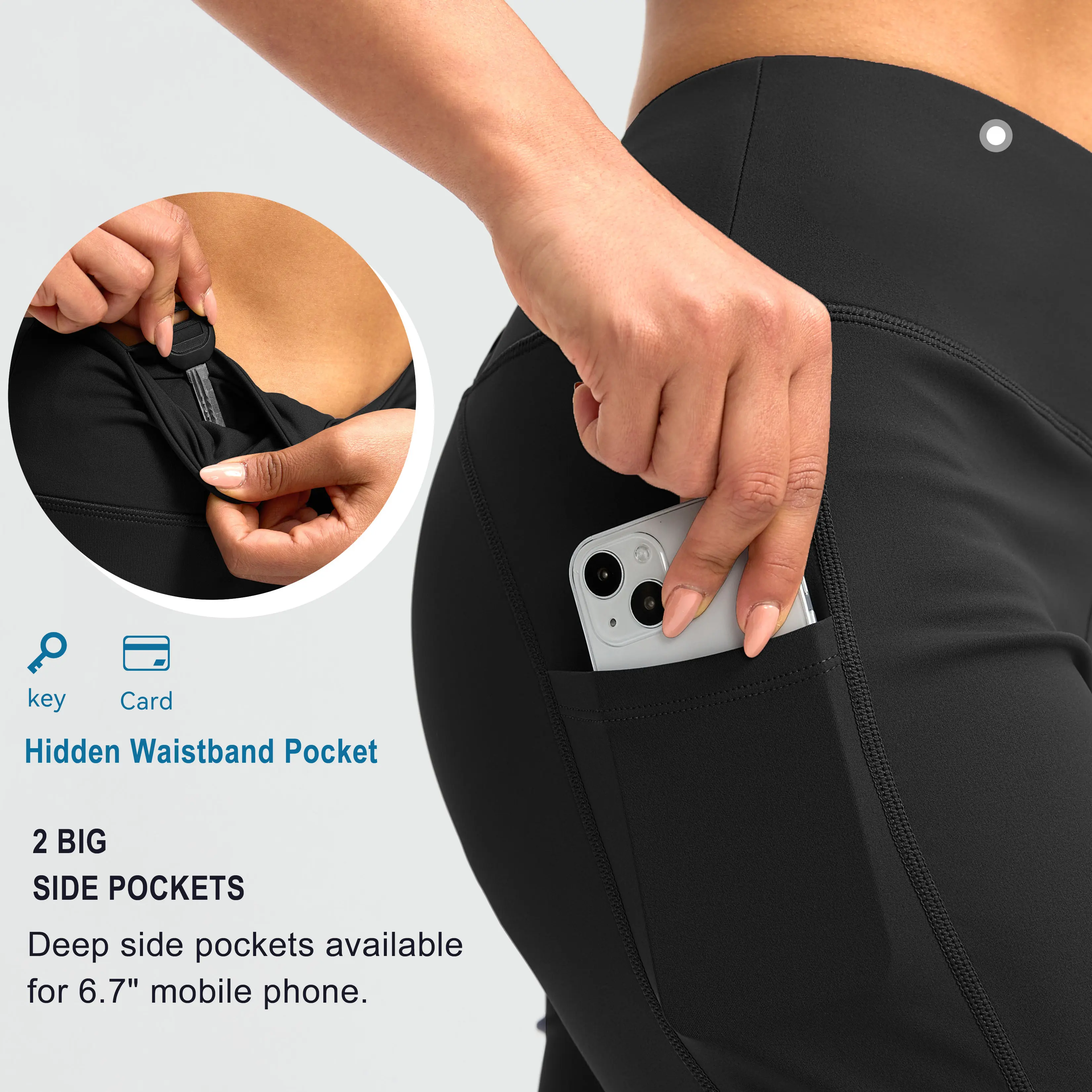 ·3 UTILITY POCKETS: 2 deep side pockets provide generous room for 6.7" phone or other belongings. 1 hidden waistband pocket for storing keys and cards.