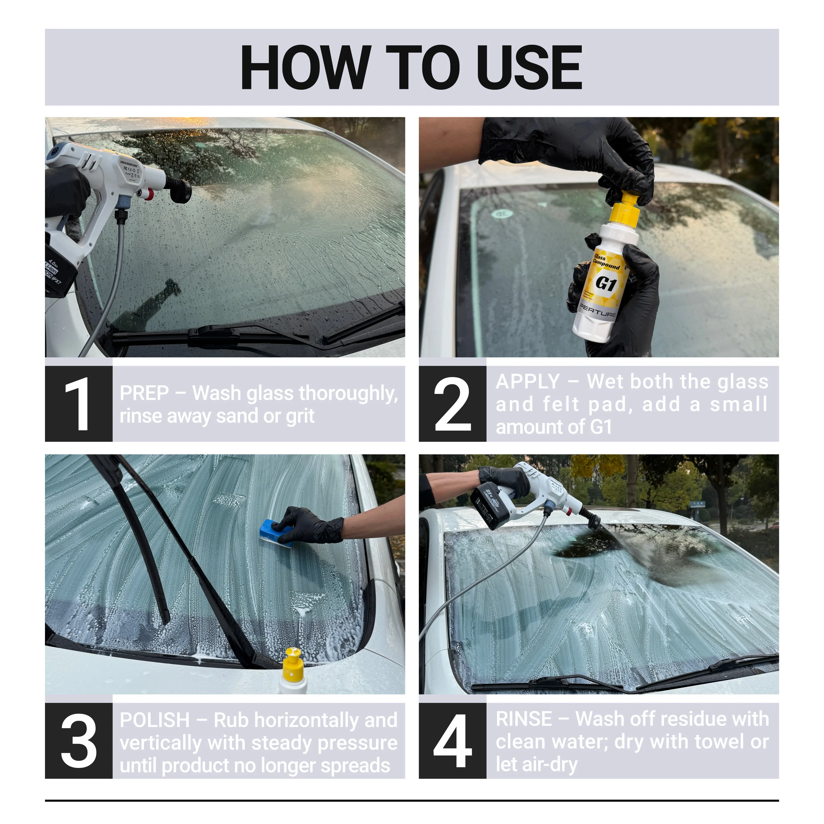 Powerful Oil Film Removal: Say goodbye to stubborn oil film, water stains, and oxidation layers. The G1 Oil Film Remover uses a unique 12,000-mesh grinding particles formula to restore your car’s glass to crystal-clear perfection.