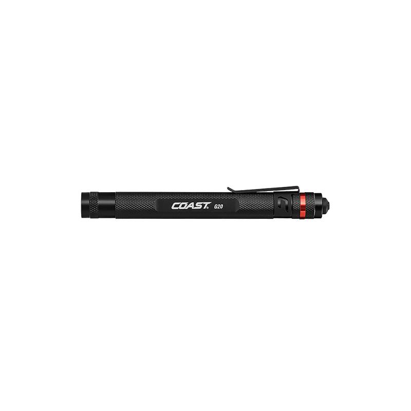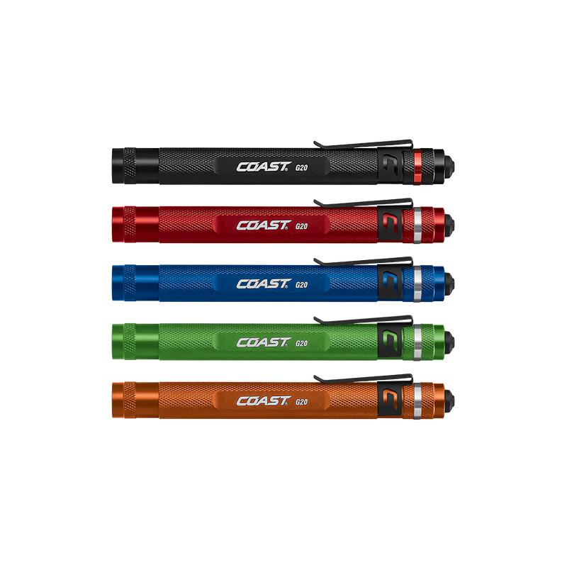 Stay ready to spot the details. The G20 penlight features COAST’s legendary Inspection Beam, prized for its perfect circle of detail-revealing, anti-glare light. No wire, connection, or leak can hide. With a beam length of 21 meters (68 feet) and run time of 11 hours, this single-mode sidekick features a steel pocket clip and weighs less than 3 ounces for easy carry—and it comes in five color options: black, red, blue, green, and orange. Built from top-grade aluminum for durability over the long run, the G20 penlight is IP54 stormproof and dust resistant, primed for the job. Built with COAST Alkaline-Dual Power technology, the G20 penlight is powered by 2 x AAA alkaline batteries and can also operate using a COAST ZITHION-X™ rechargeable battery (sold separately) for added convenience and cost savings. Â