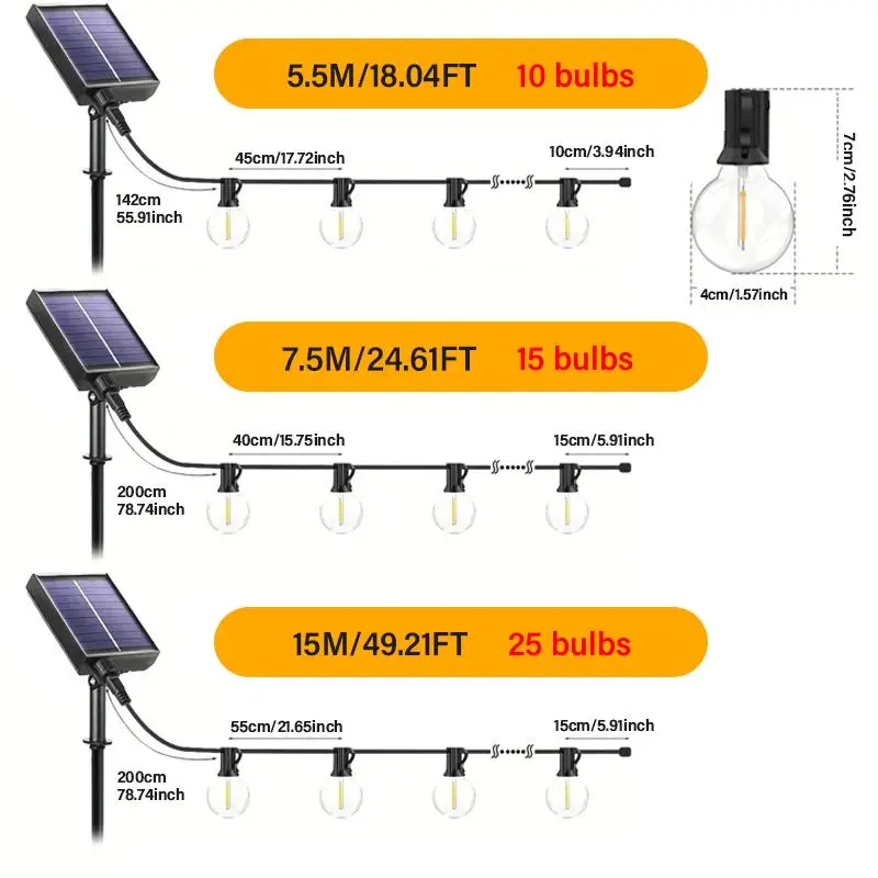 5. Solar Powered G40 String Light, 1 Box LED G40 Shatterproof Bulb, Dimmable Led Lights Patio Pendant Light with Remote Control, Suitable for Commercial Streets, Cafes, Yards