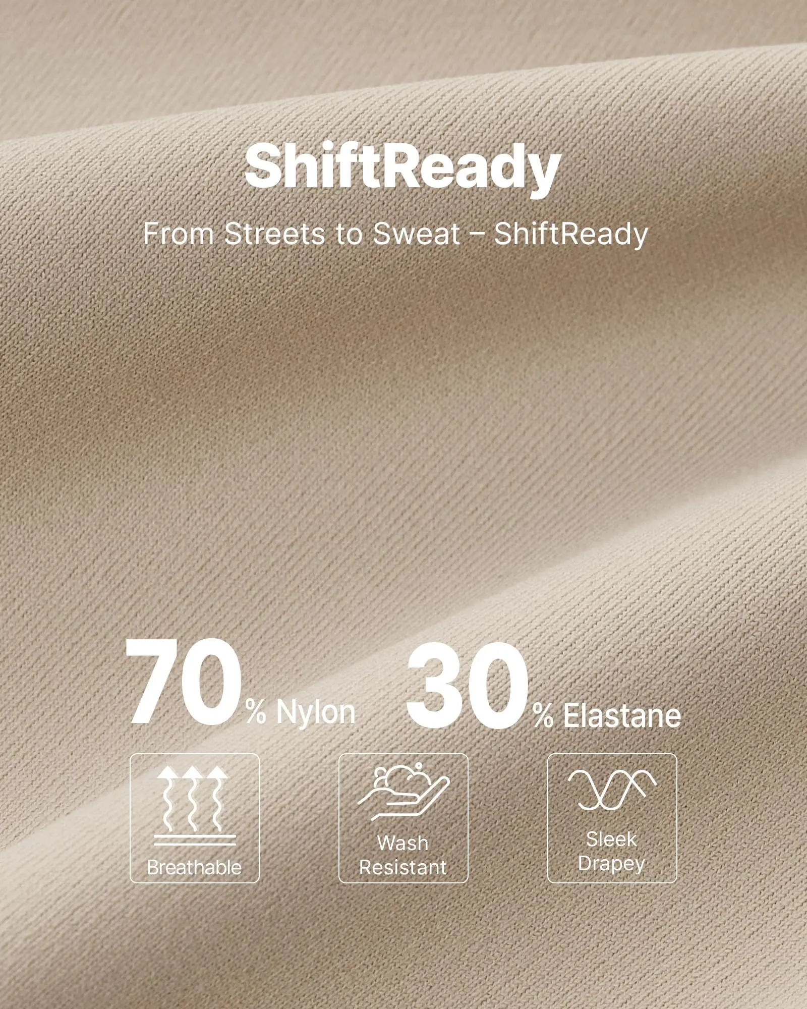 ·Shiftready fabric, sleek and drapey for relaxed fit, feels cool to the touch, wash resistant