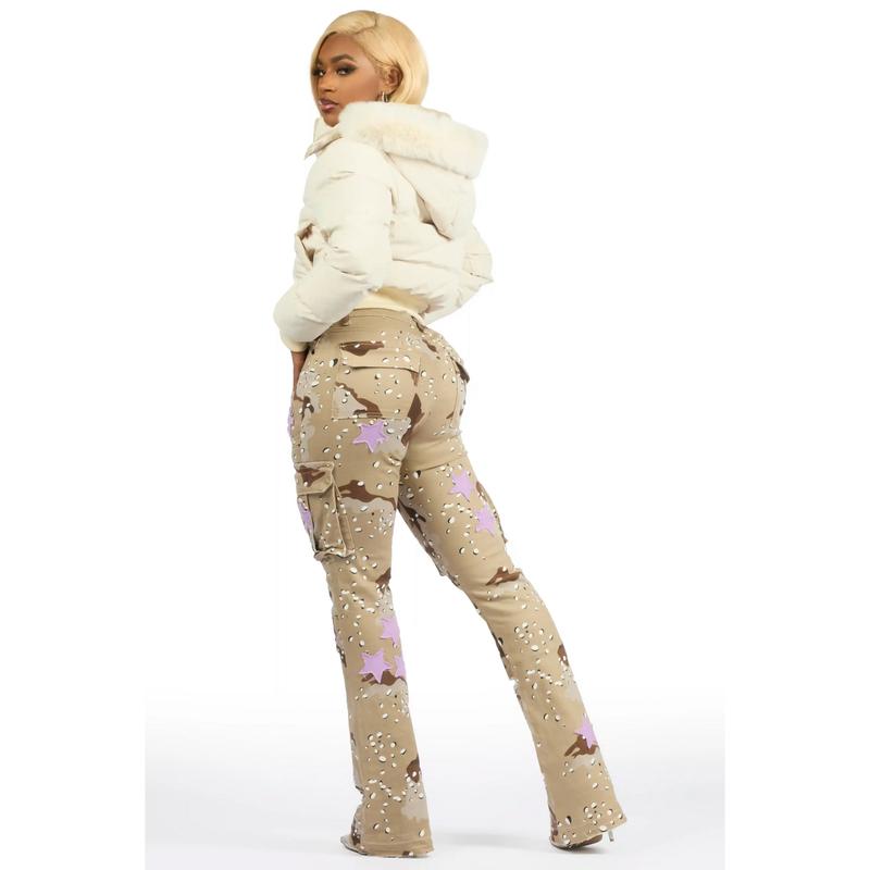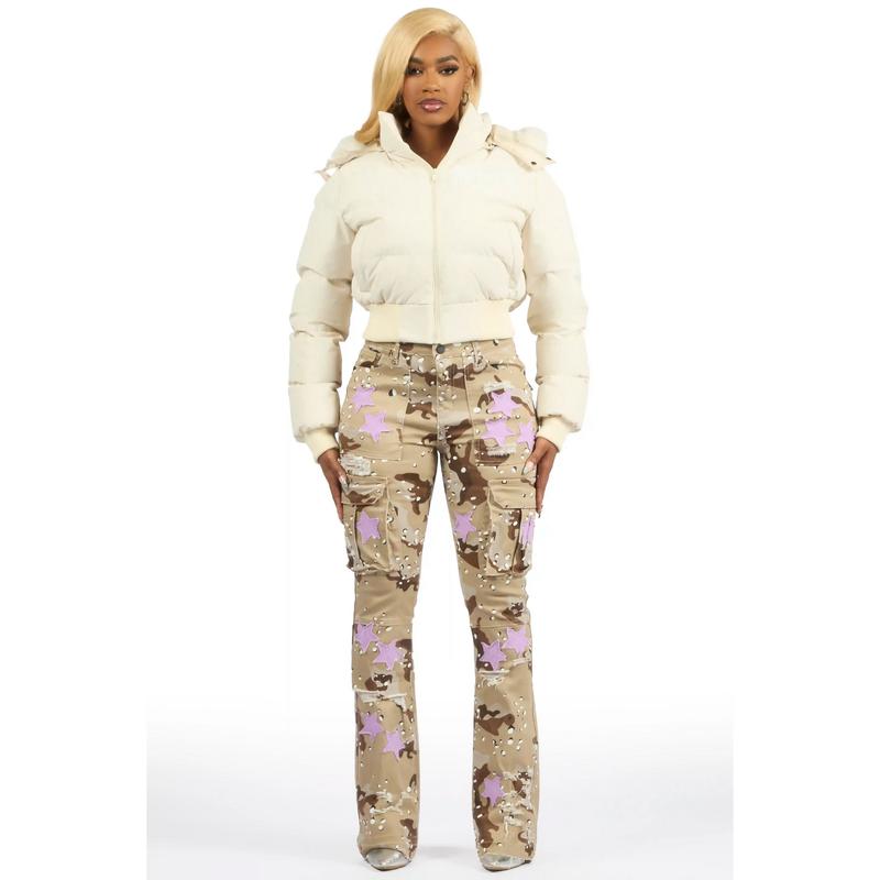 An urban quilted puffer jacket for women in beige. Designed with water-resistant fabric and insulation for a versatile streetwear style.