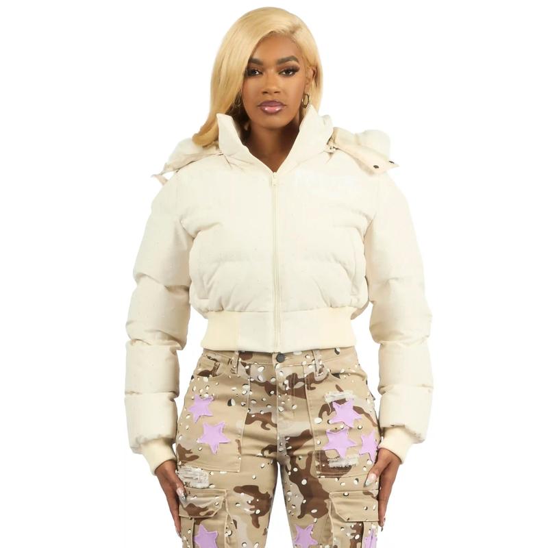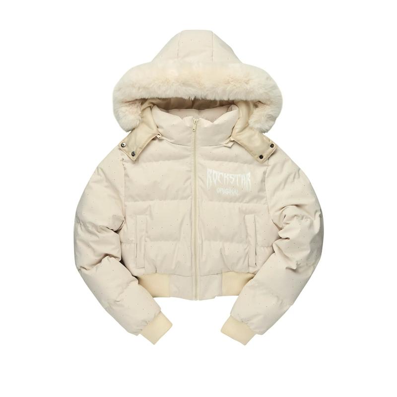 Gabrielle Beige Rhinestone Puffer Jacket With Fur Hood