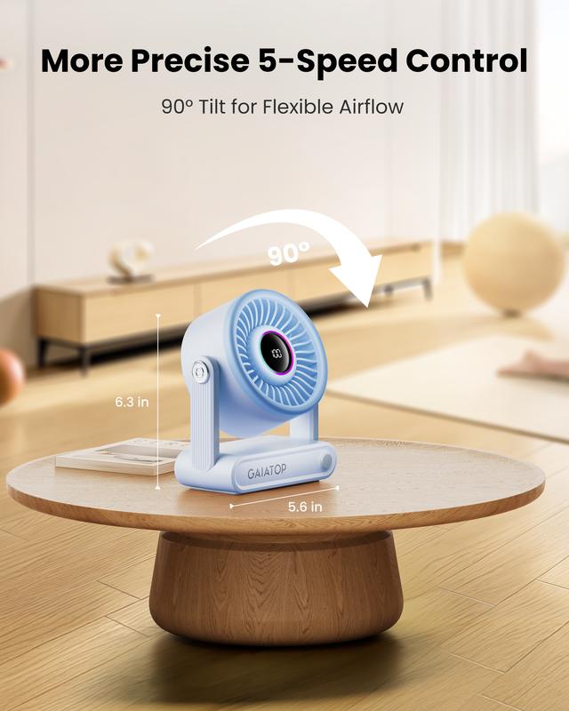 Enjoy a cool, tranquil breeze with 5 adjustable speeds (3.2 to 5.0 m/s) and a 90° tilt head. The LED display shows speed and battery level, paired with a colorful breathing mood light for a modern touch. 🌟