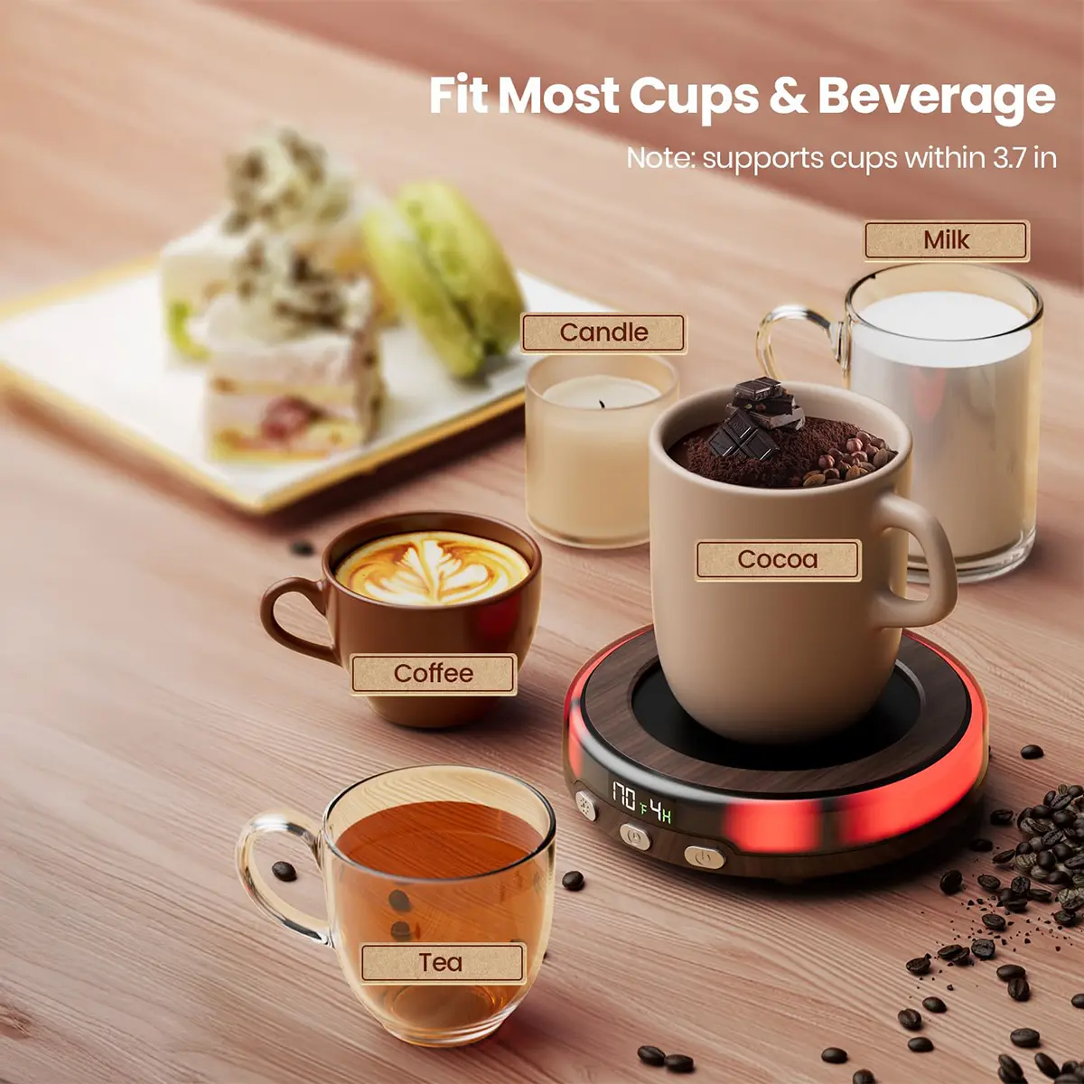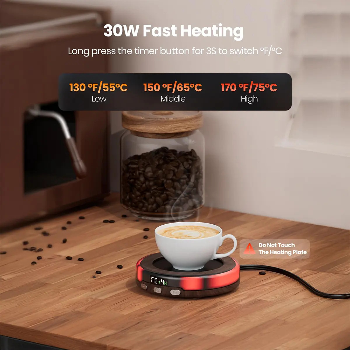 This 50W GAIATOP mug warmer heats up fast with 3 adjustable tempsā170°F, 150°F, 130°Fākeeping your coffee hot all day! The LED display shows temp and timer, while the warm strip light signals itās onālong press 3 seconds to turn off the lights.