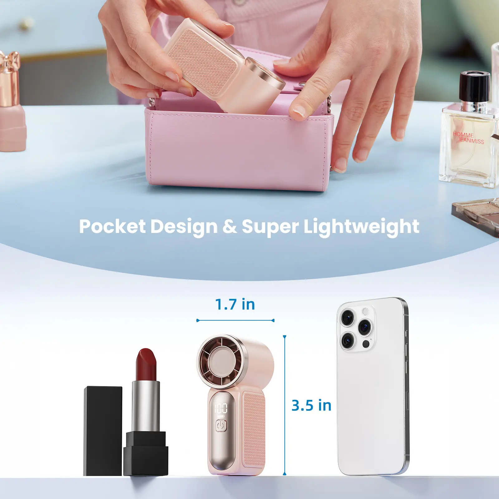 ·Powerful Motor, Wide Cooling CoverageThis fan’s smart design beats traditional mini fans with efficient, concentrated airflow. It wraps your face and neck in a strong breeze, keeping makeup intact even on the sweatiest days!