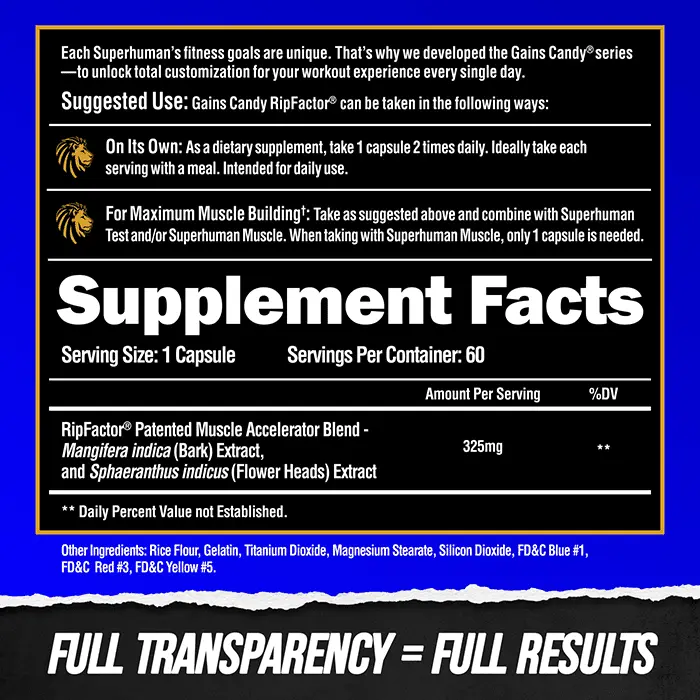 Gains Candy RipFactor® (60 servings) is the unmatched muscle-builder for concentrated muscle growth. Studies have shown significant increases in both muscle size & overall body strength in as fast as 14 days.†