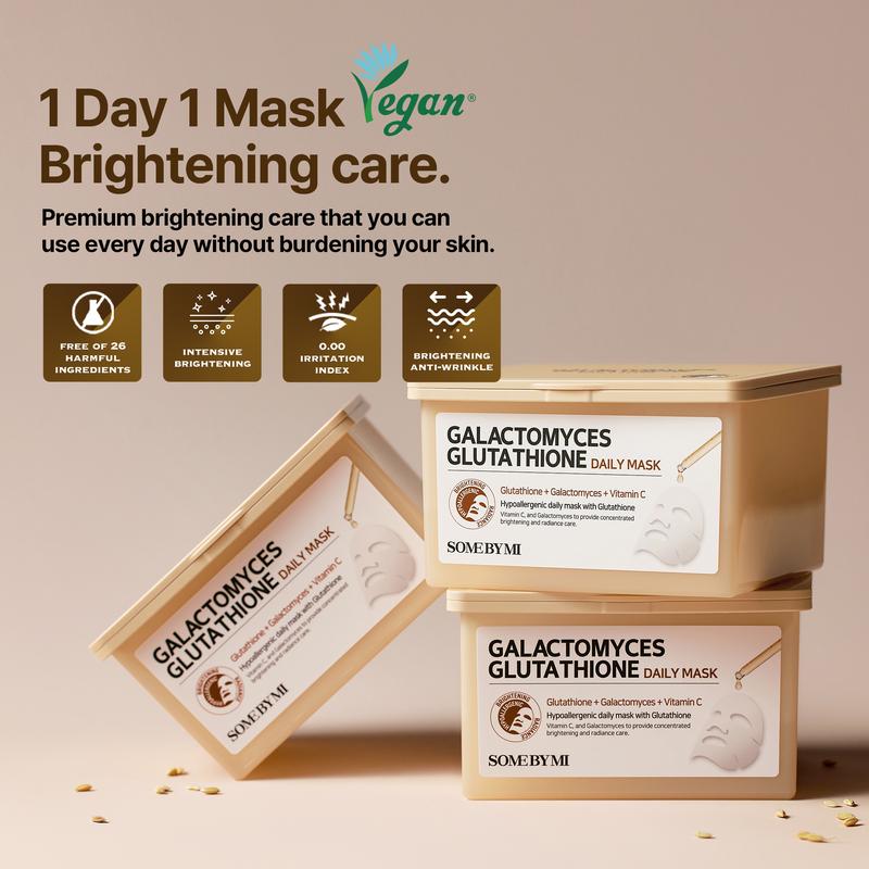 Introducing the [SOME BY MI] Galactomyces Glutathione DAILY MASK, a skincare essential in a convenient pack of 30 sheets. Each pack contains 350ml of the mask, ideal for daily use. This product is designed to provide benefits from galactomyces and glutathione. The exact application and benefits are not specified.