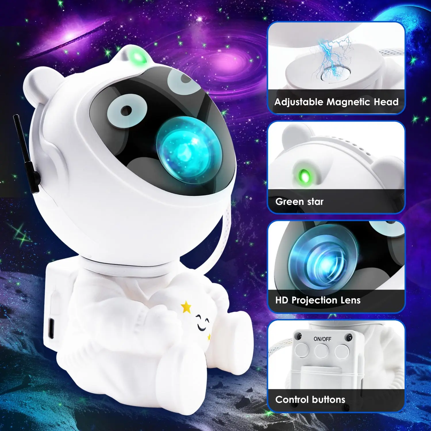 This nebula projector adopts the astronaut's appearance design to echo the theme of the Milky Way, bringing you a dreamlike visual effect. The astronaut's head supports 360° rotation, which is easy to adjust the nebula projection angle, and can be projected anywhere in a fixed position Unrestricted, not only an astronaut star projector, but also a good looking decoration.