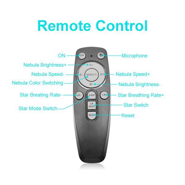 The star projector has two control methods: buttons on the back and remote control. You can adjust the switch between nebula mode and starlight mode, the color and brightness of nebula, and the flickering frequency of stars. Stars or nebula patterns can be used together or individually. In addition, you can set the timer for 60 or 120 minutes, and it will automatically turn off when the set time is reached.