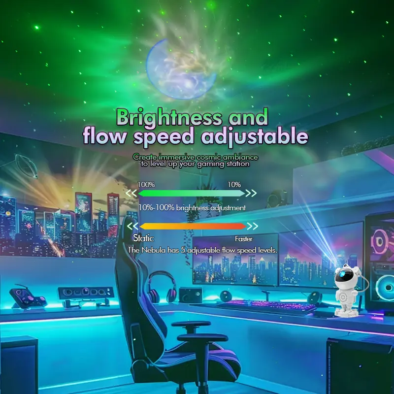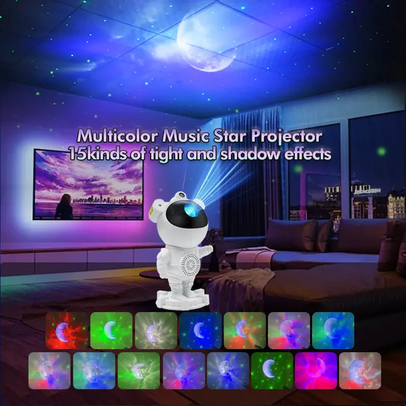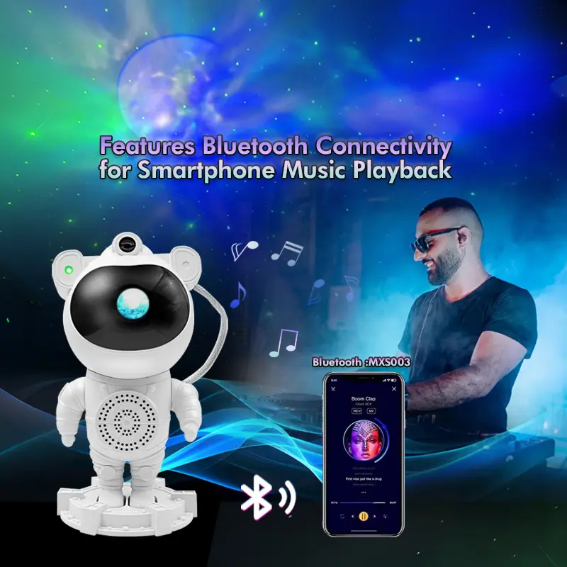Pair with "MXS003" for music playback. The Rhythm Mode follows the music beat, creating an energetic party atmosphere. RGBW nebula, stars, and moon move rhythmically to the beat.