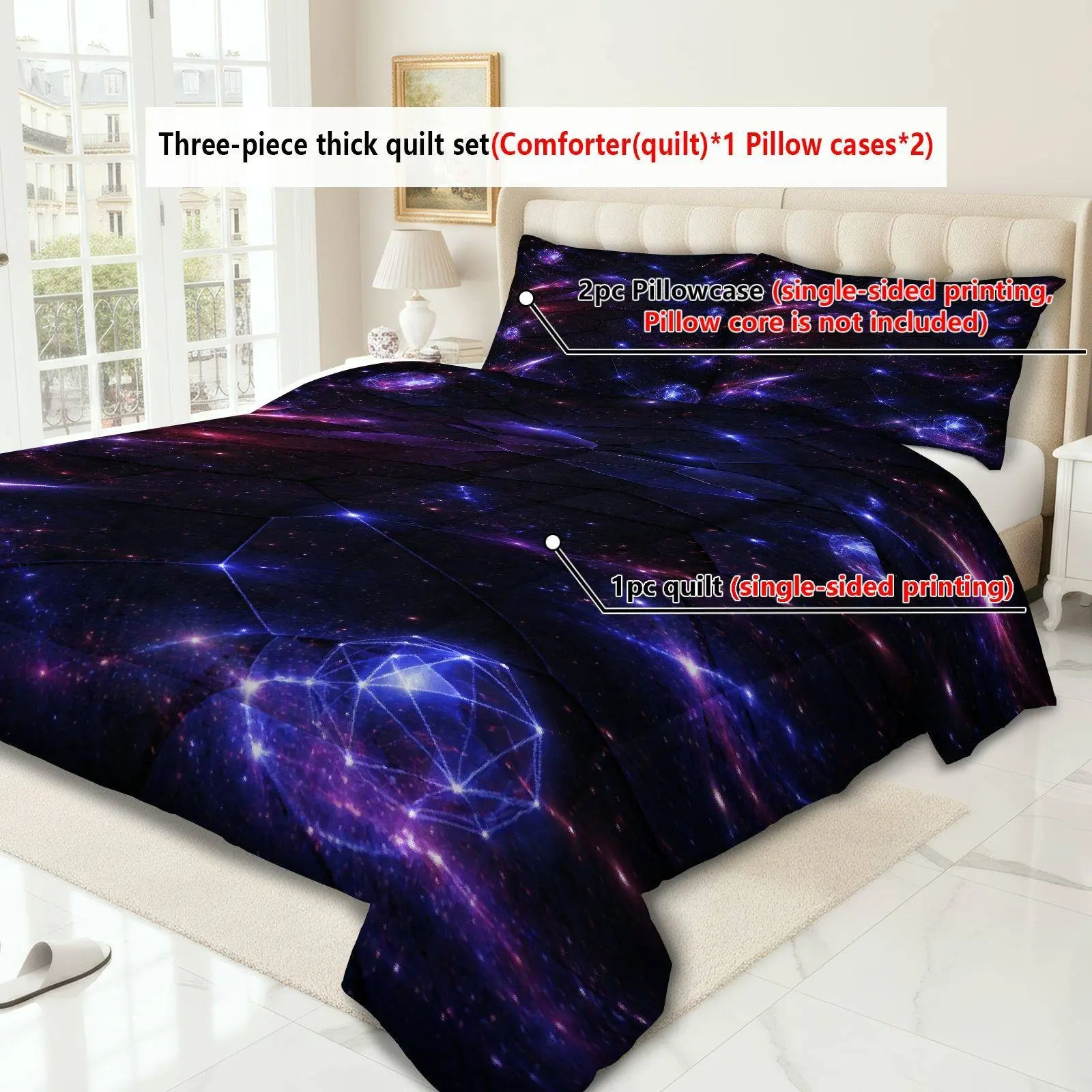 Galaxy Starry Sky Bedding Set, Soft Breathable Polyester, Includes 1 Quilt and 2 Pillowcases, Universe Theme