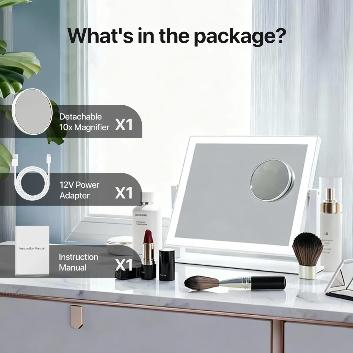 ·Comes with a dedicate power adapter and instruction manual. The mirror has a stable base for secure and hassle-free use on your vanity.