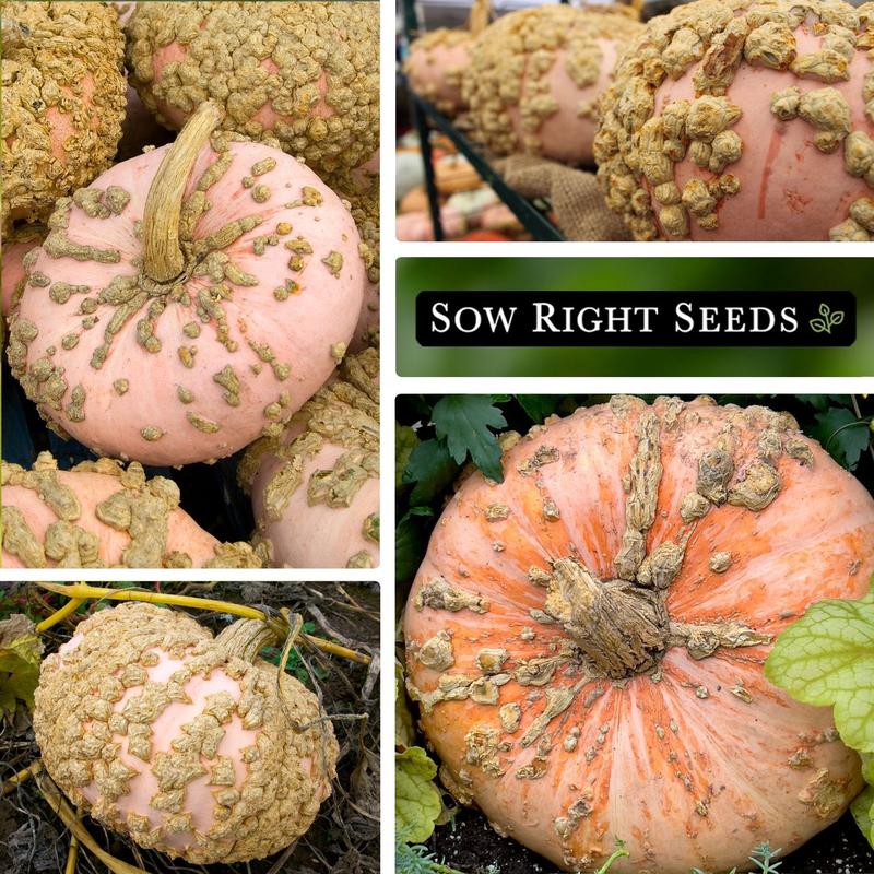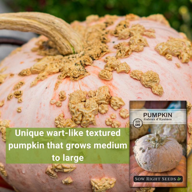 Also known as Peanut Pumpkin, Galeux d'Eysines (Cucurbita pepo) is a super sweet French heirloom with salmon skin and bumpy warts that look like peanuts. The warts are formed by sugar oozing out through the skin as it matures and grows sweeter. The super sweet flesh is bright orange and is wonderful for baking. It also does double duty as striking fall decor. Seed packet contains 5 G (about 26 seeds).