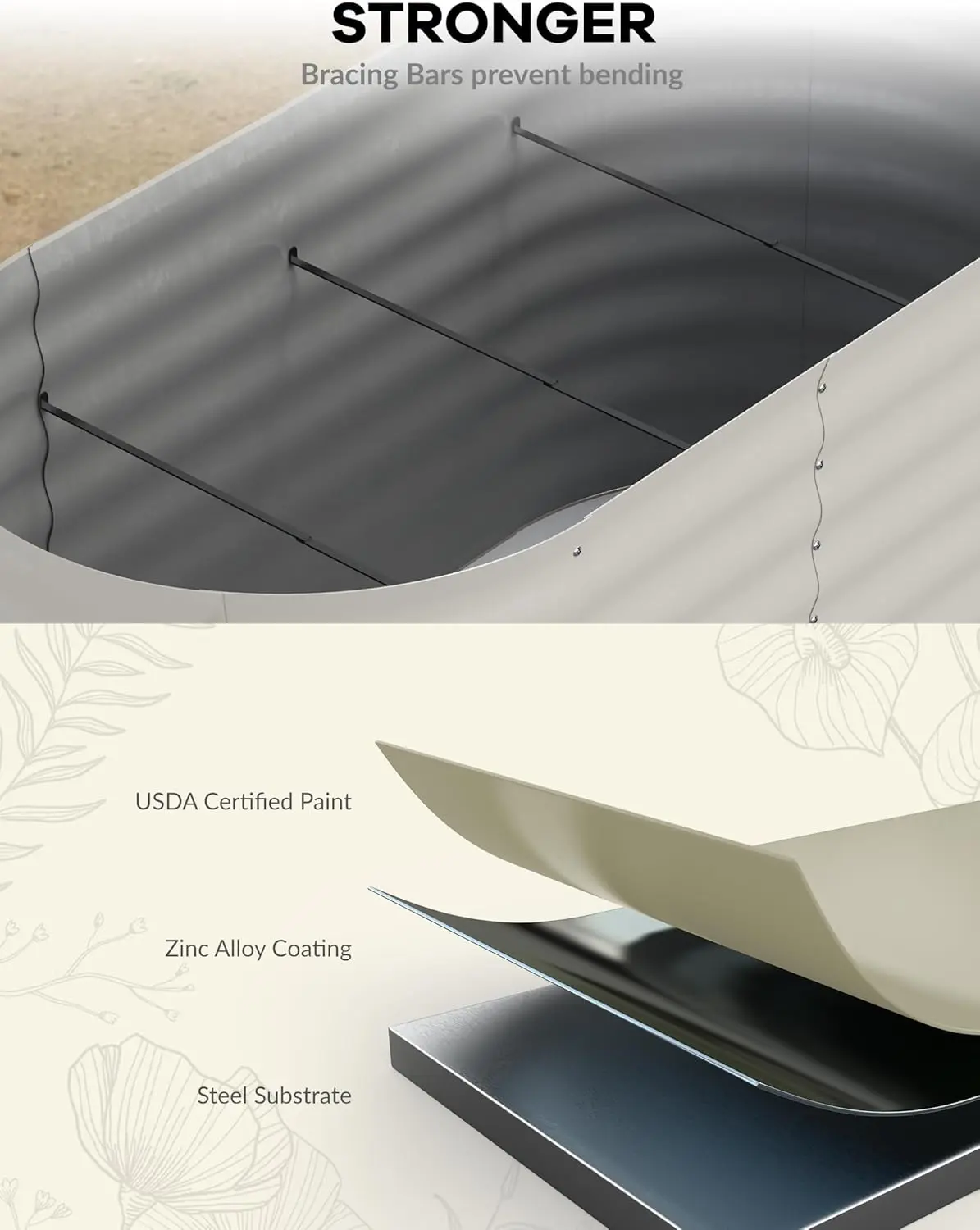 [Open-bottom Design] The open-bottom design of the planting bed promotes root growth, improves drainage, enhances soil health, regulates temperature, reduces competition, facilitates maintenance, and fosters an environment for sustainable plant growth