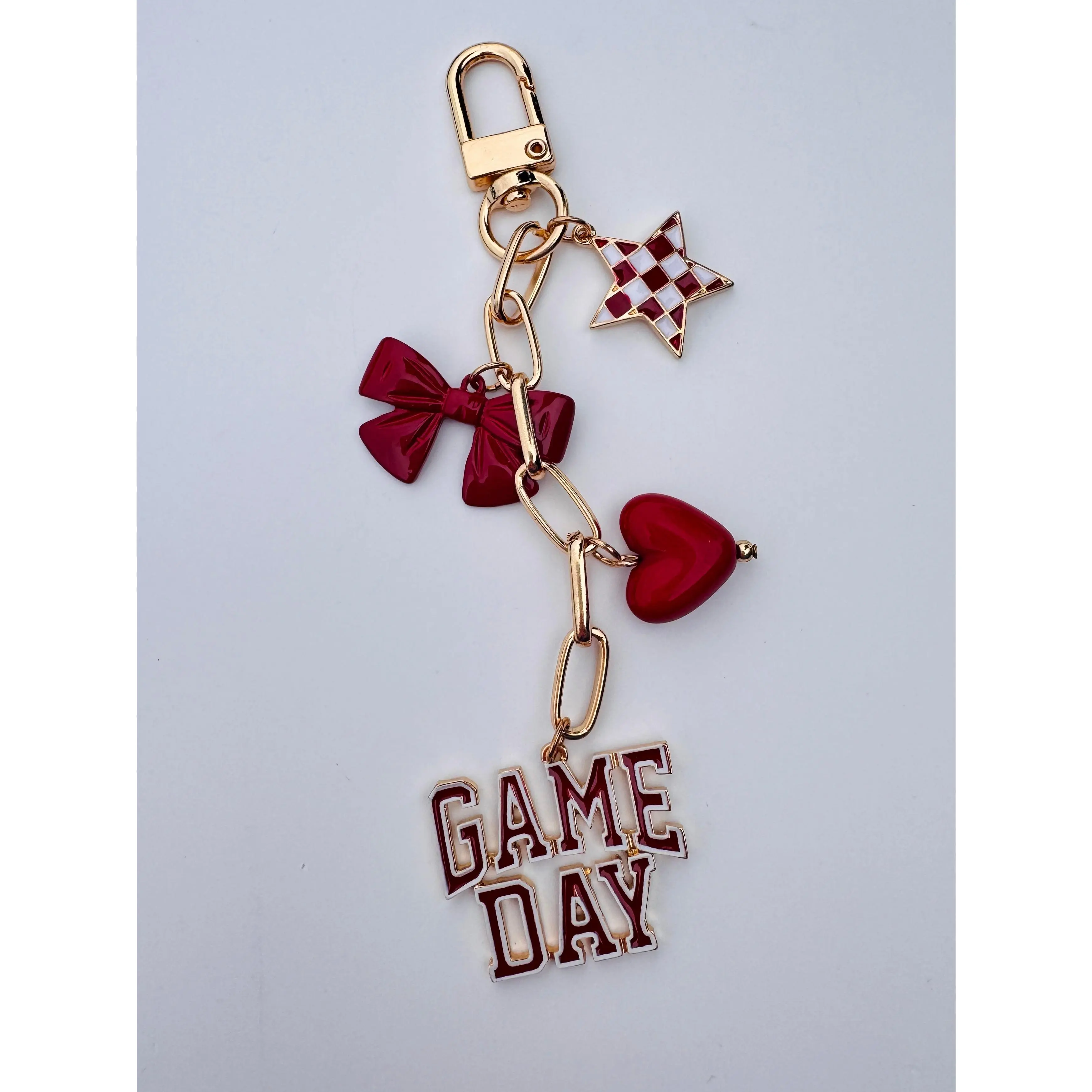 Add a pop of team spirit to your bag with our Game Day Purse Charms! Each charm features bold enamel lettering, colorful bows, hearts, and stars on a gold-tone chain. Perfect for showing off your game day pride while keeping your look fun and stylish.