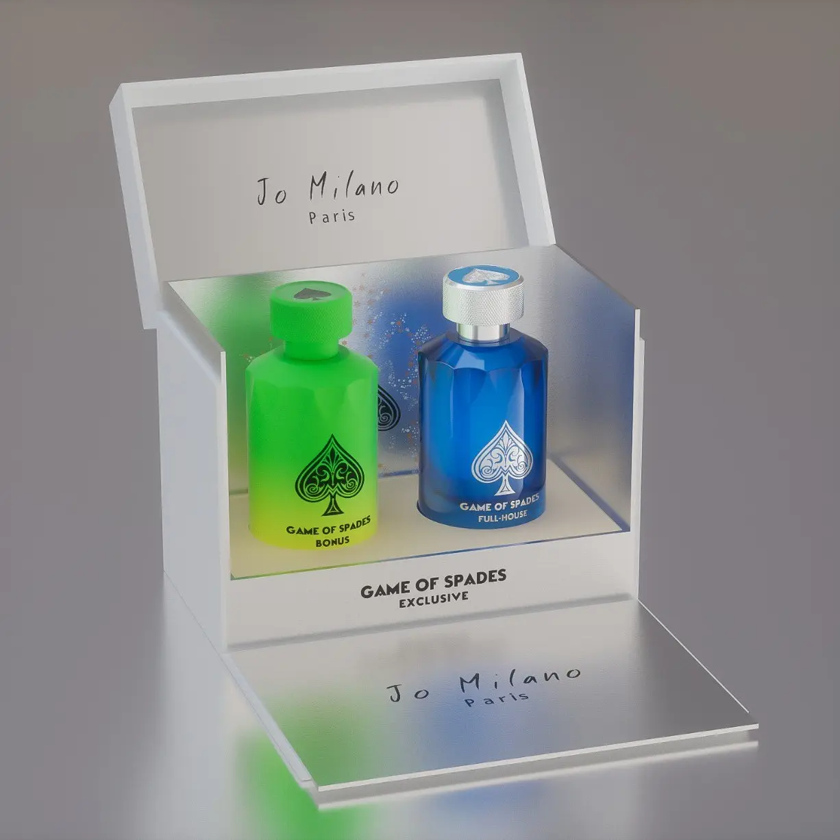 Step into luxury with this powerful duo from Jo Milano Paris. Full House is rich, daring, and irresistibly smooth. It opens with fresh, captivating notes, revealing a deep blend of woods, amber, and spice. Bonus brings modern, magnetic, and effortless confidence. Its refined balance of freshness and warmth makes it perfect for day and night.
