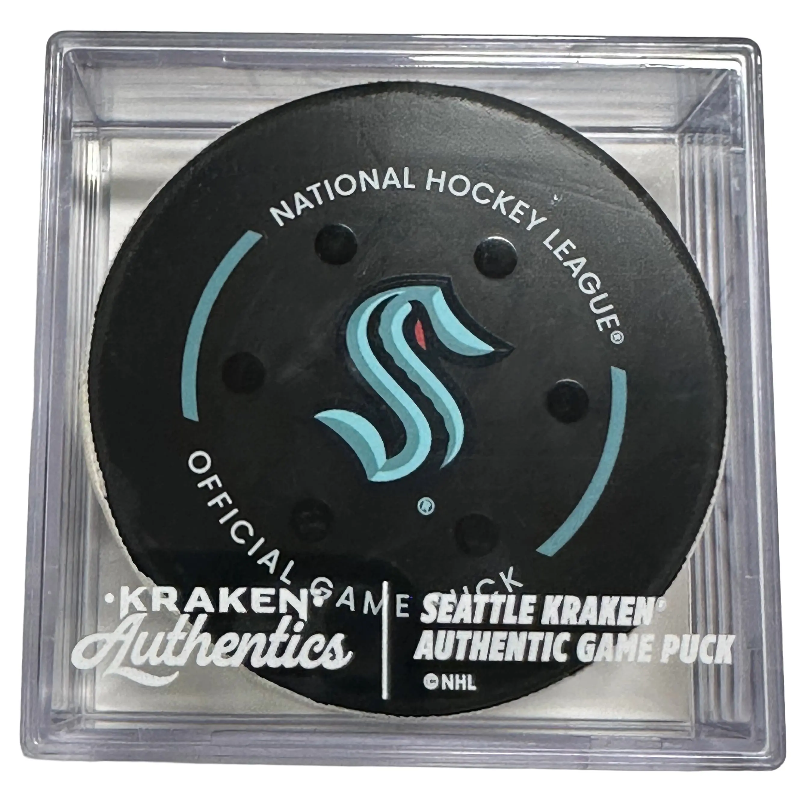 This game-used puck is authenticated by OpSec and includes a Certificate of Authenticity along with a Kraken Authentics puck cube.