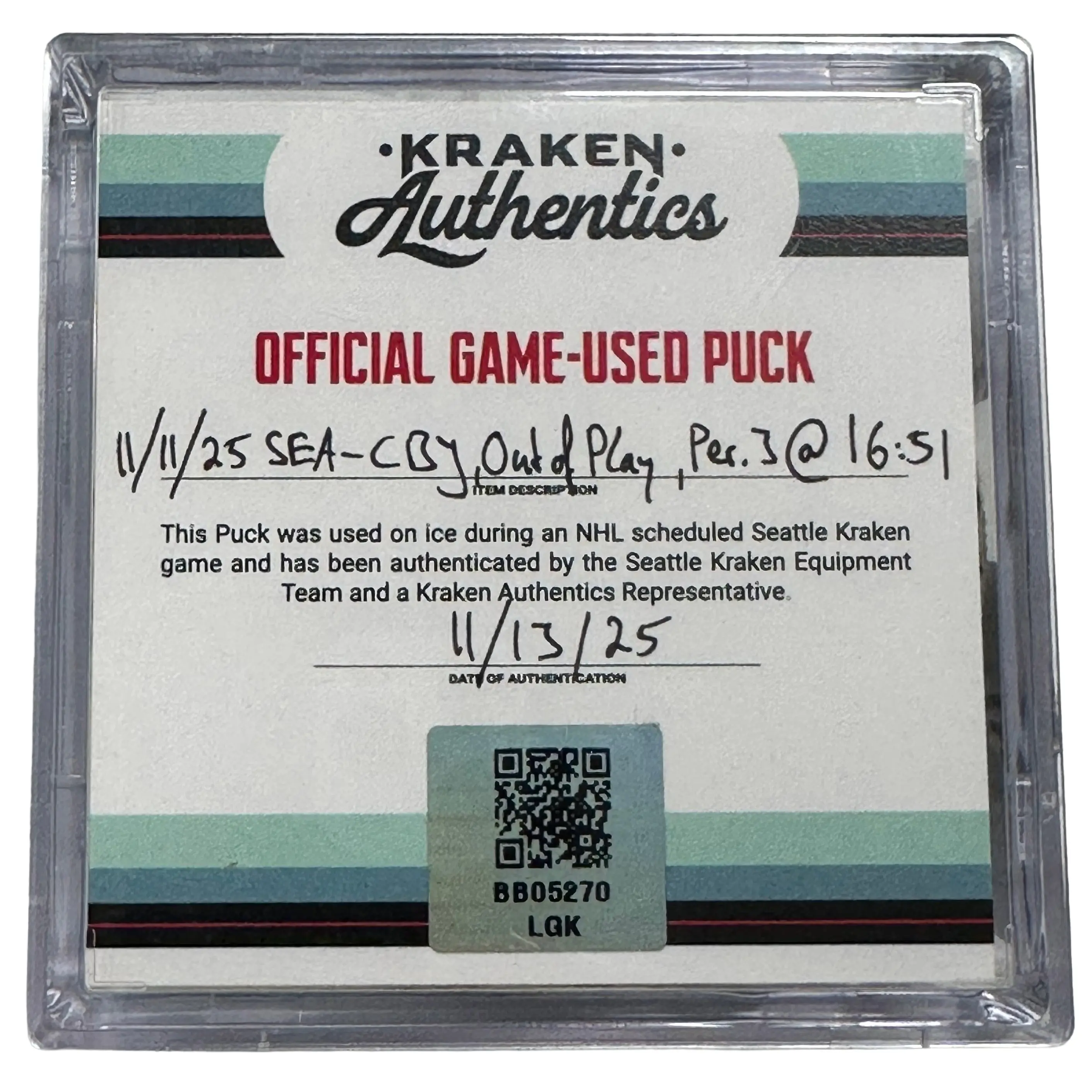 Official game-used puck from the Seattle Kraken vs. Columbus Blue Jackets game on November 11, 2025. The puck went out of play at 16:51 of the 3rd period and was retrieved directly from the ice.