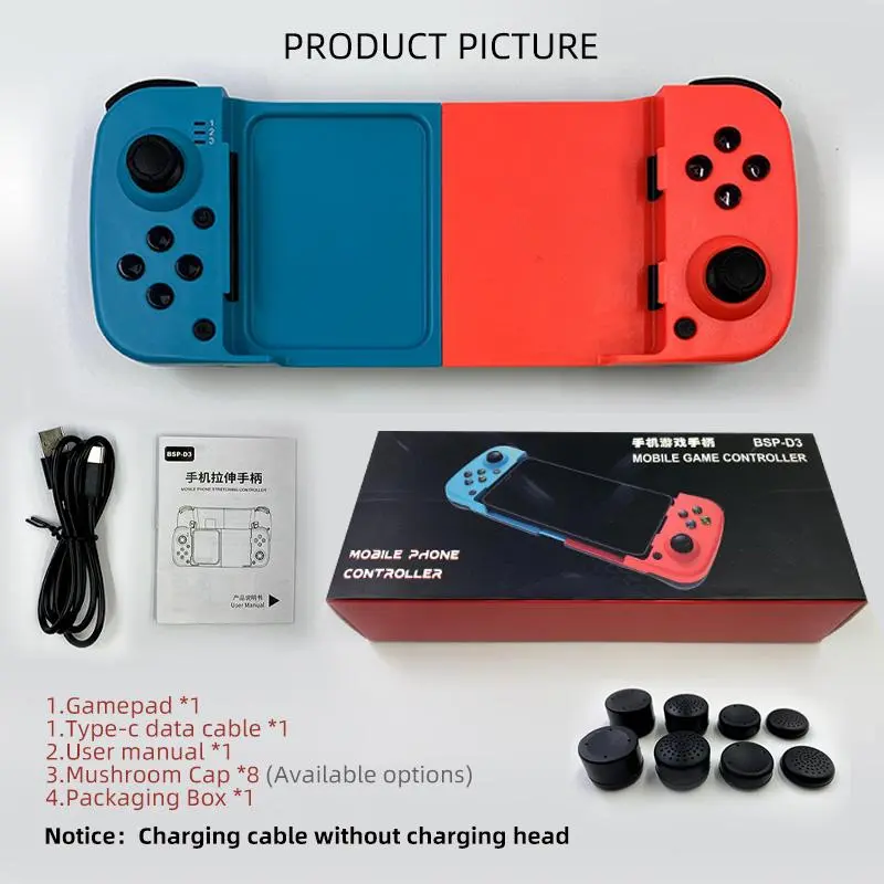 Ever wanted a gaming controller that fits your hand and works with all your devices? The BSP-D3 Gamepad is your new best friend for gaming on iOS, Android, PC, PS4, and Switch. Its dual joysticks stretch from 135mm to 173mm, giving you a comfy grip no matter your style. The delicate buttons and crisp micro-motor shoulder buttons make every move feel precise and responsive. Plus, with M1/M2 macro programming, you can customize your gameplay with one-touch combos and speed adjustments. The borderless design means no awkward edges to get in your way during intense sessions. Inside the box, you'll find the gamepad, a Type-C data cable, a user manual, and 8 mushroom caps to swap joystick tops. Just remember, you'll need your own charging adapter since the cable doesn't include one. Whether you're chilling on your couch or on the go, this portable controller is ready to level up your gaming experience. Grab your BSP-D3 and get playing today!