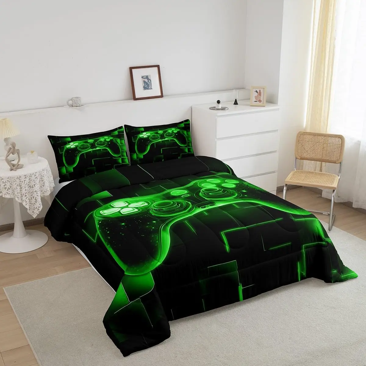 Gamer Comforter Set,Gaming Video Games Gamepad Bedding Comforter Sets,Neon Glowing Square Geometric Grid Green Bedroom Decor Duvet Insert
