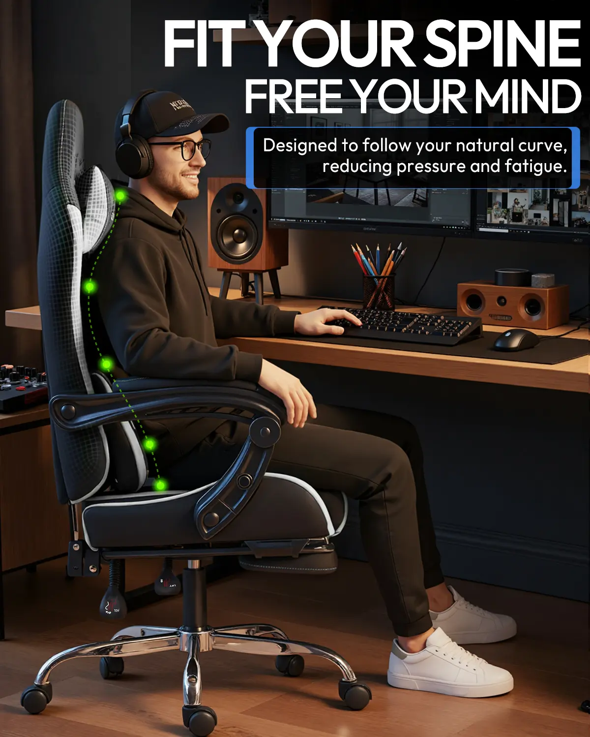 ·Say Goodbye to Back Fatigue: Integrated Massage & Alignment Stop letting back pain ruin your killstreak. Our built-in USB-powered massage lumbar support and adjustable headrest keep your spine in its natural "S" curve. Whether it’s a 10-hour esports tournament or a late-night study session, you’ll stay focused and ache-free.