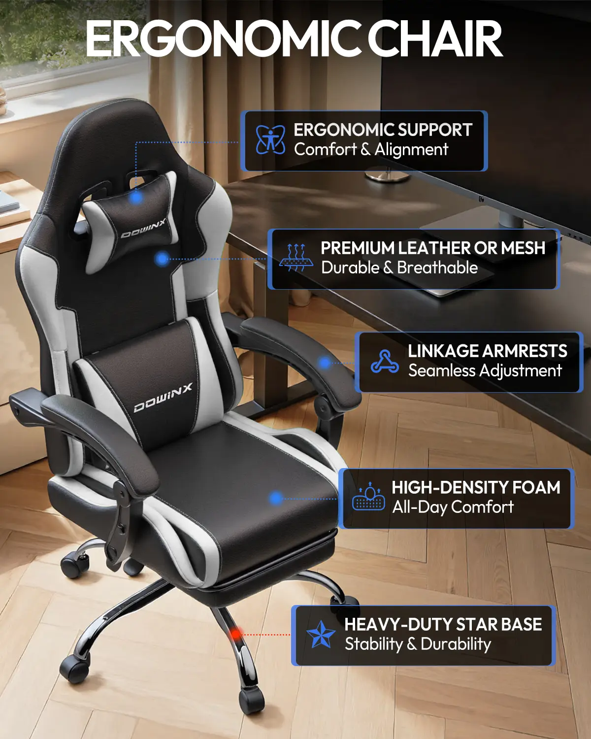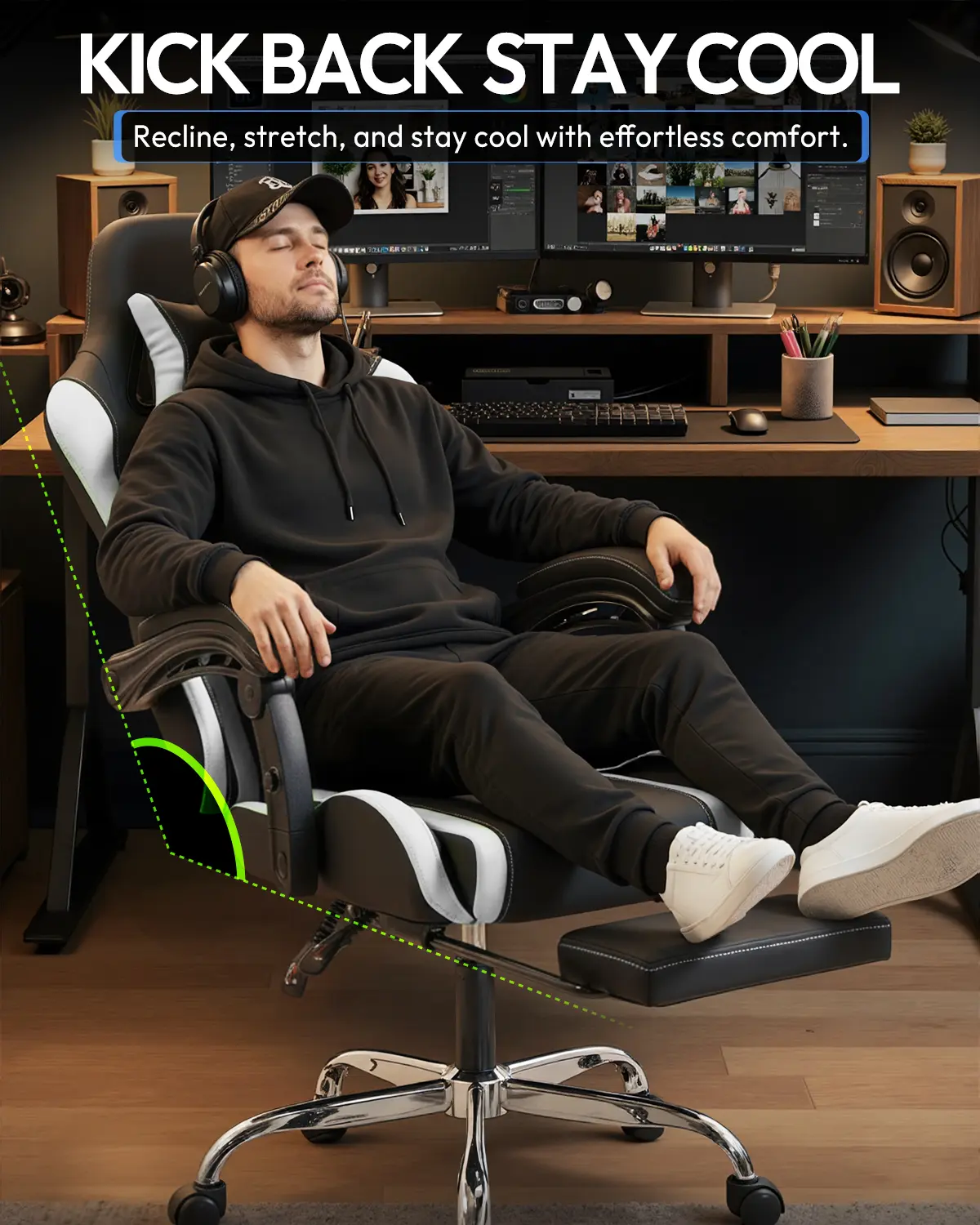 ·Breathable Luxury: Premium PU Leather & Cooling Mesh Stay cool when the game gets heated. Our hybrid design combines premium breathable PU leather with strategic mesh panels to maximize airflow. The sleek white racing-style aesthetic doesn't just look "pro"—it elevates your entire streaming setup or modern home office.