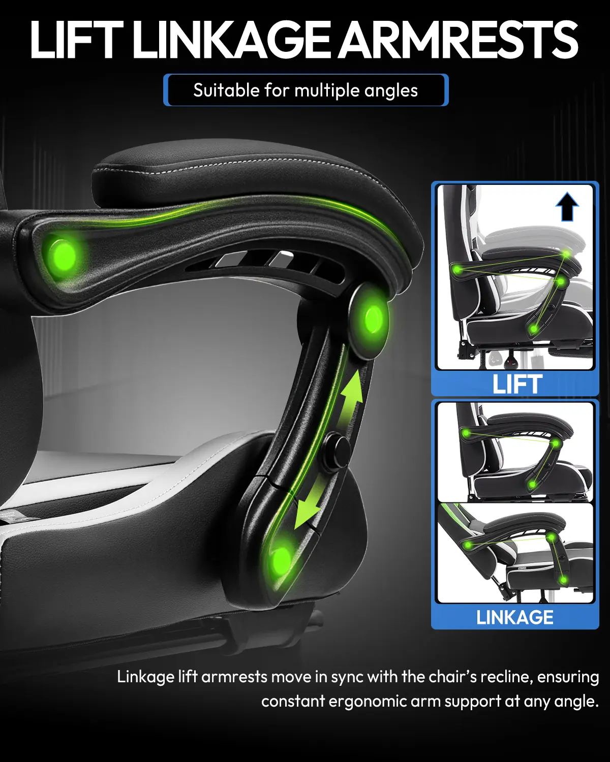 ·Work, Play, or Nap: 150° Recline & 2D-Linkage Armrests Adapt to every mode of your day. Flip the lever to recline up to 150° for a quick power nap, or stay upright for intense focus. The 2D-linkage armrests automatically adjust their angle as you lean back, ensuring your elbows are always supported—no more "floating arm" discomfort.