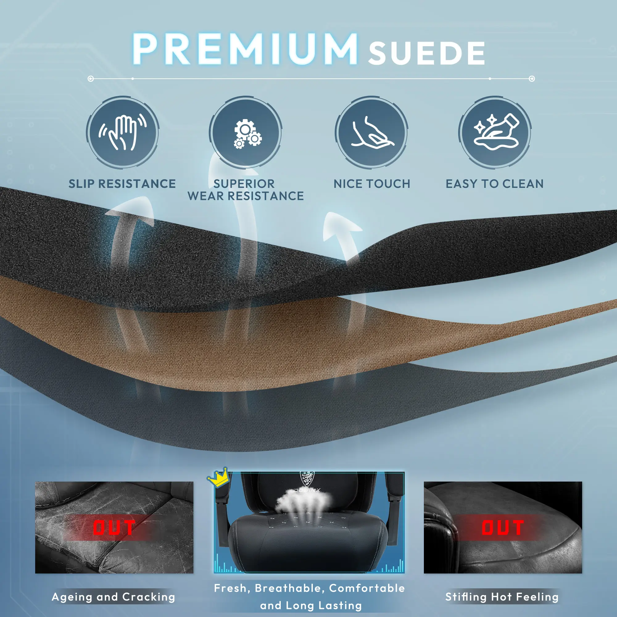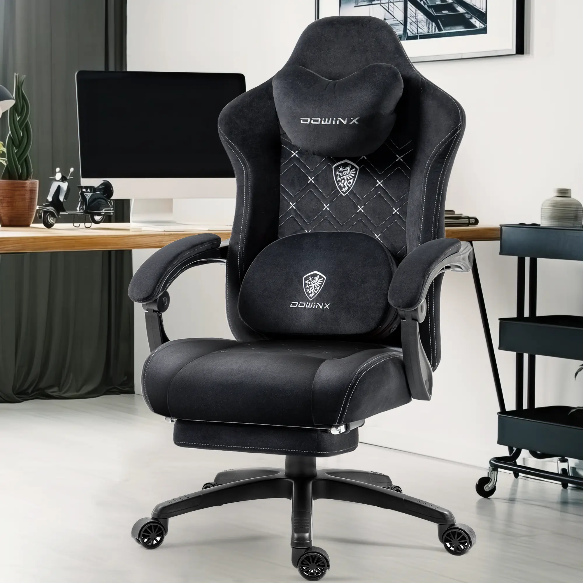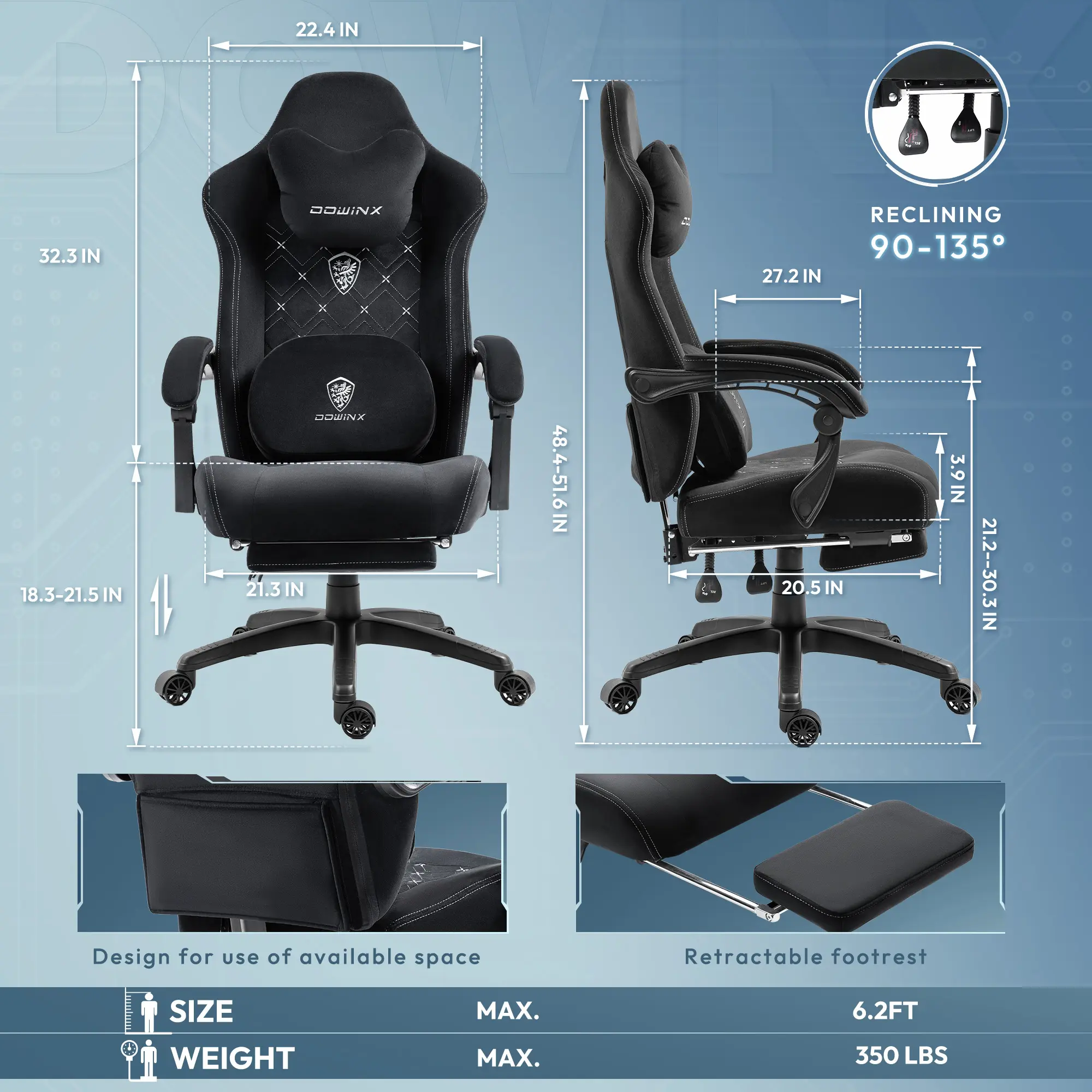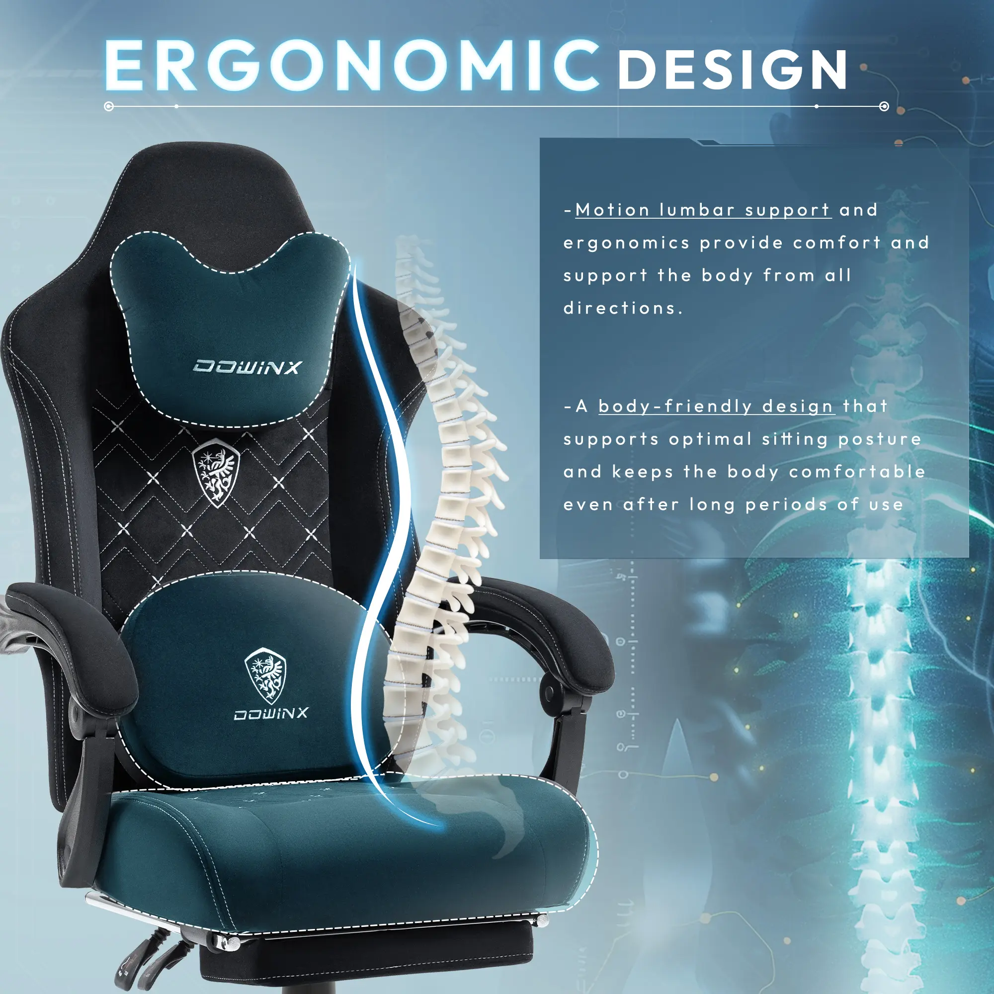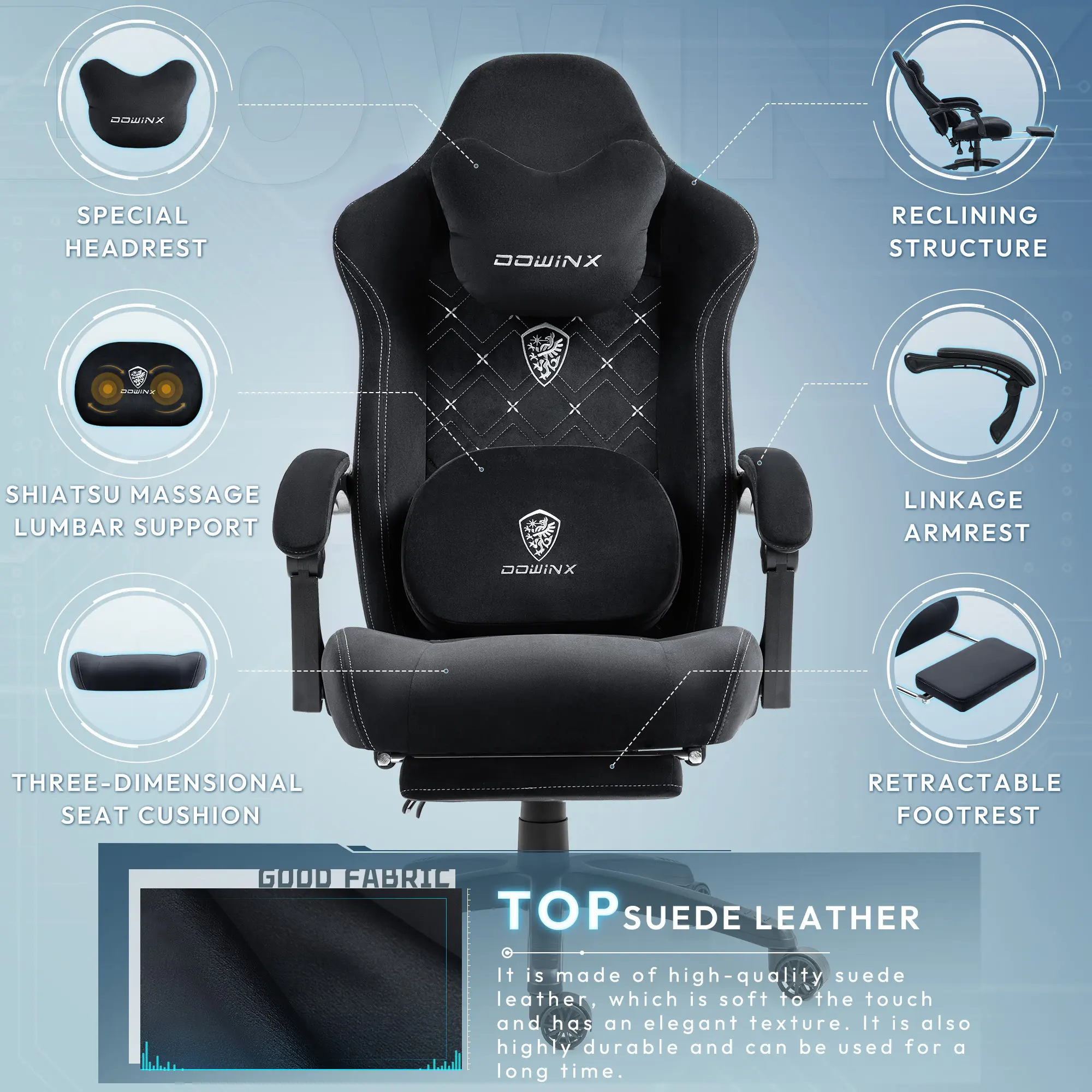 ·ăMulti-Use Heated Massage Gaming ChairăDowinx gaming chair with massager is specially designed for sedentary people who are prone to low back pain. Intelligent finger sensation massage, circular kneading stiff waist for deep relaxation, effectively reducing discomfort. Adjustable heating function accelerates fatigue relief and allows you to feel warm when you're alone or late at night. Unique double-sided design, turn the reverse side up when not massaging for a softer support experience.