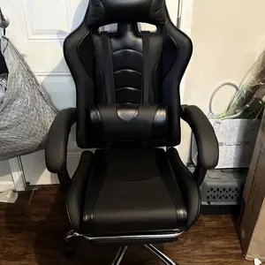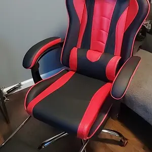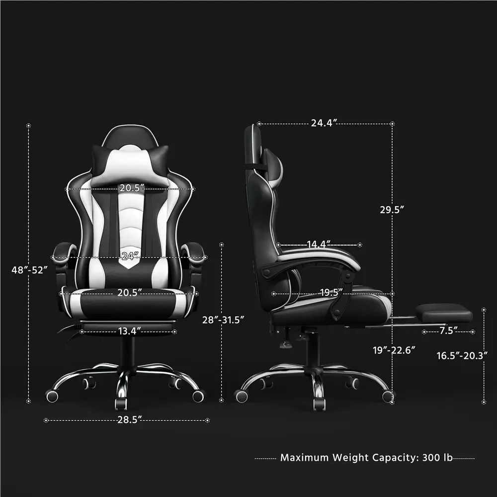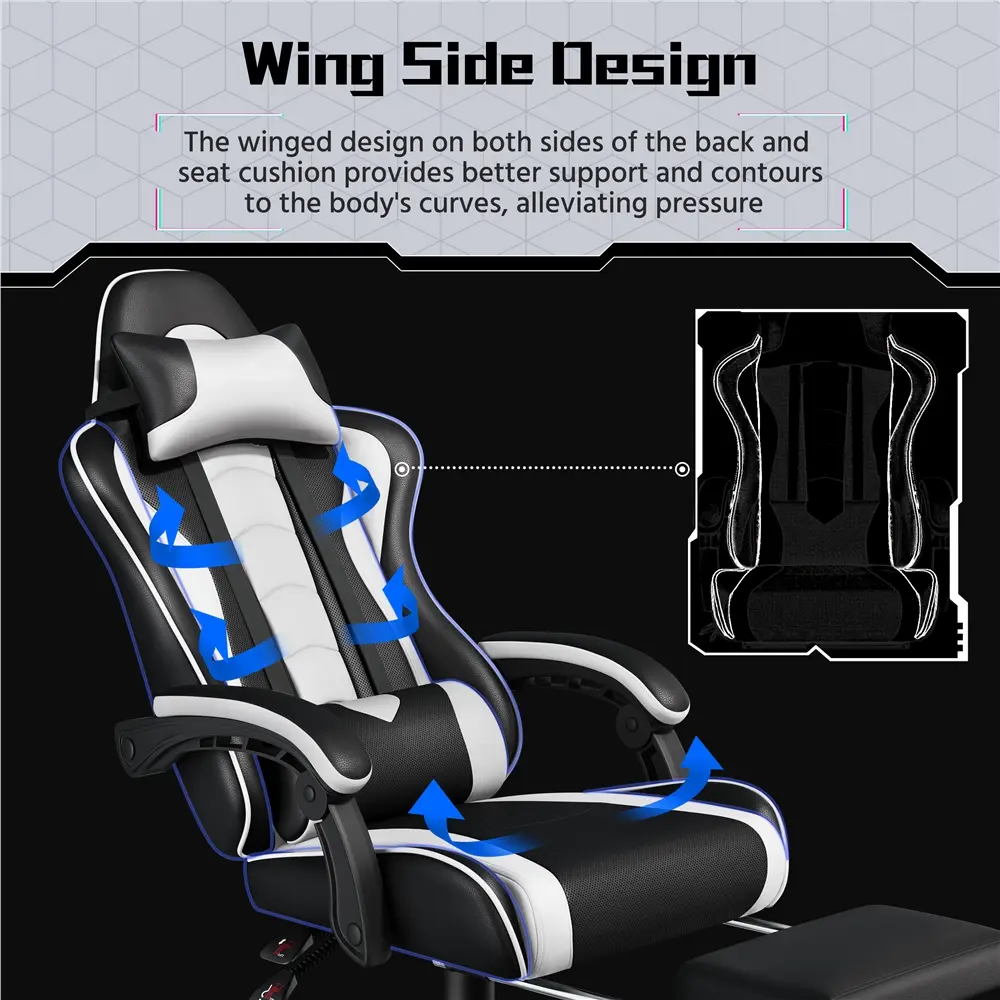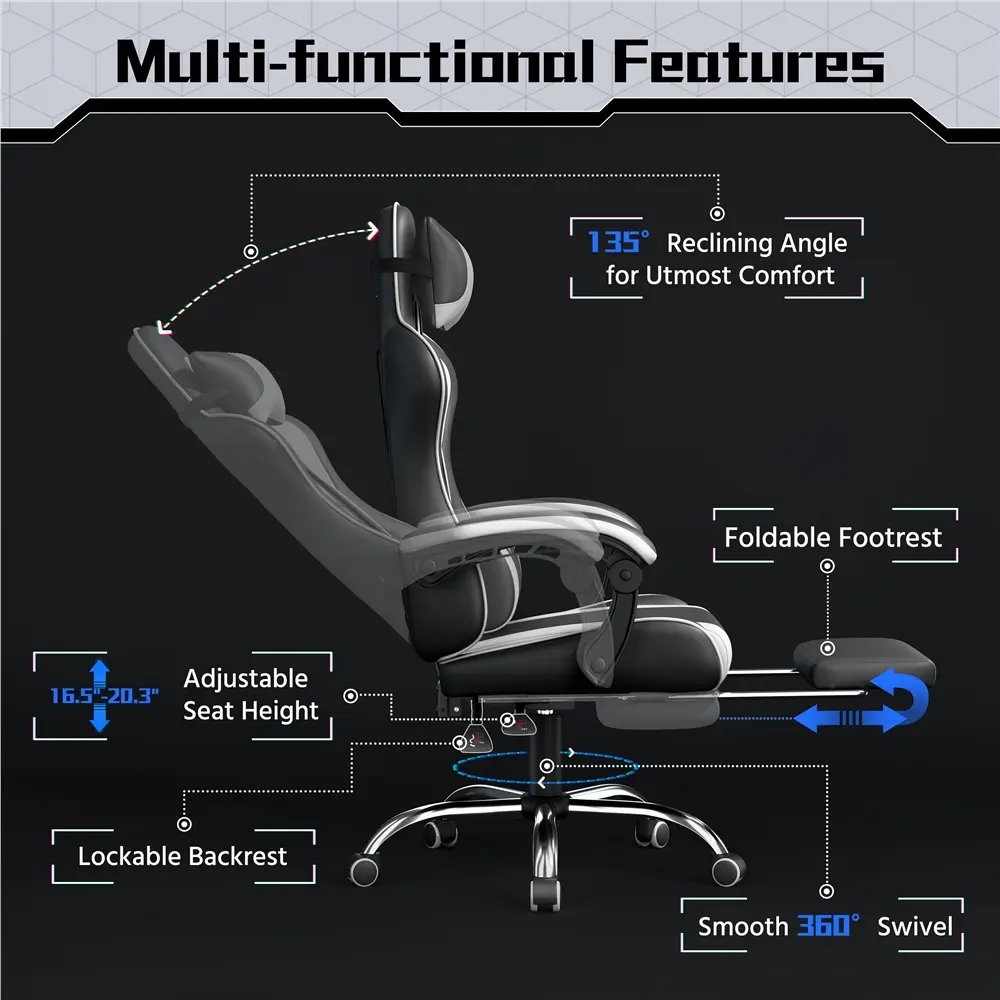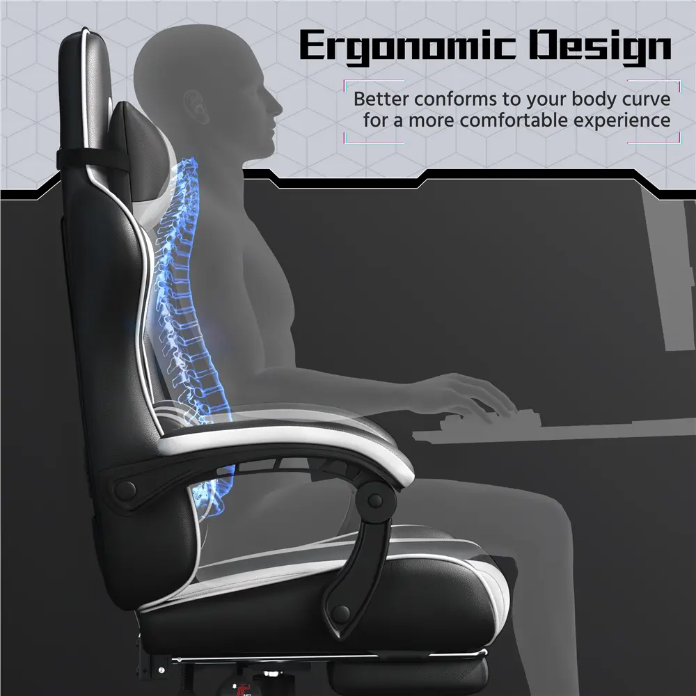 Take your gaming to the next level with this racing gaming chair with footrest. Designed for the ultimate gaming experience, this ergonomic swivel chair has everything you need to stay comfortable during long gaming sessions. Adjust the seat height, recline up to 135 degrees and extend the footrest for maximum relaxation. Plus, the desk chair includes a removable head pillow, a massage lumbar pillow, and padded armrests for extra support. The mute castors and wide metal base ensure a safe and stable gaming experience. With a classic color scheme and racing seat-inspired design, this faux leather gaming chair is not just for the game room - it's fantastic for your home office, bedroom, study, dorm room and more.