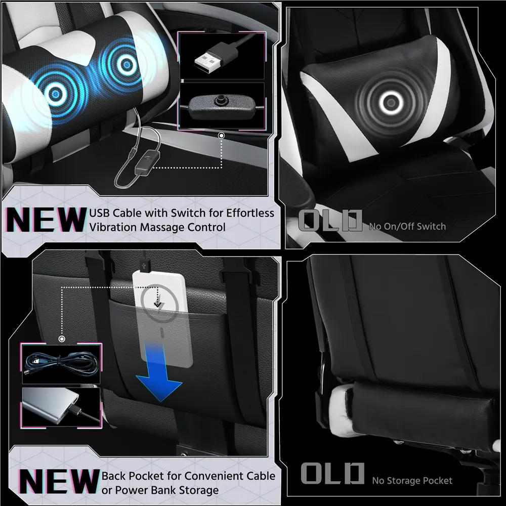 ·Massage Lumbar Pillow: USB-activated lumbar pillow and cushioned footrest enhance comfort, with a back pocket for cable storage.