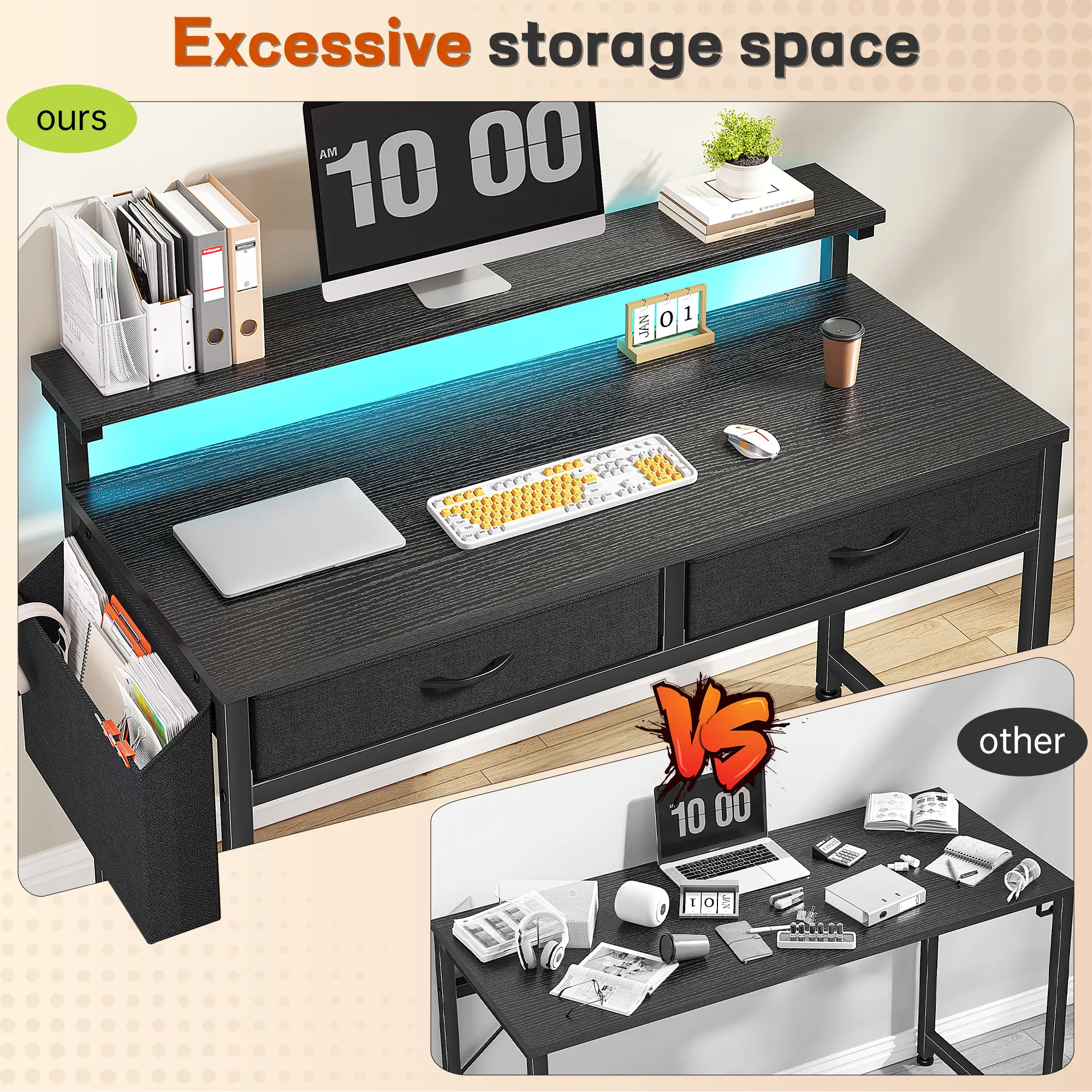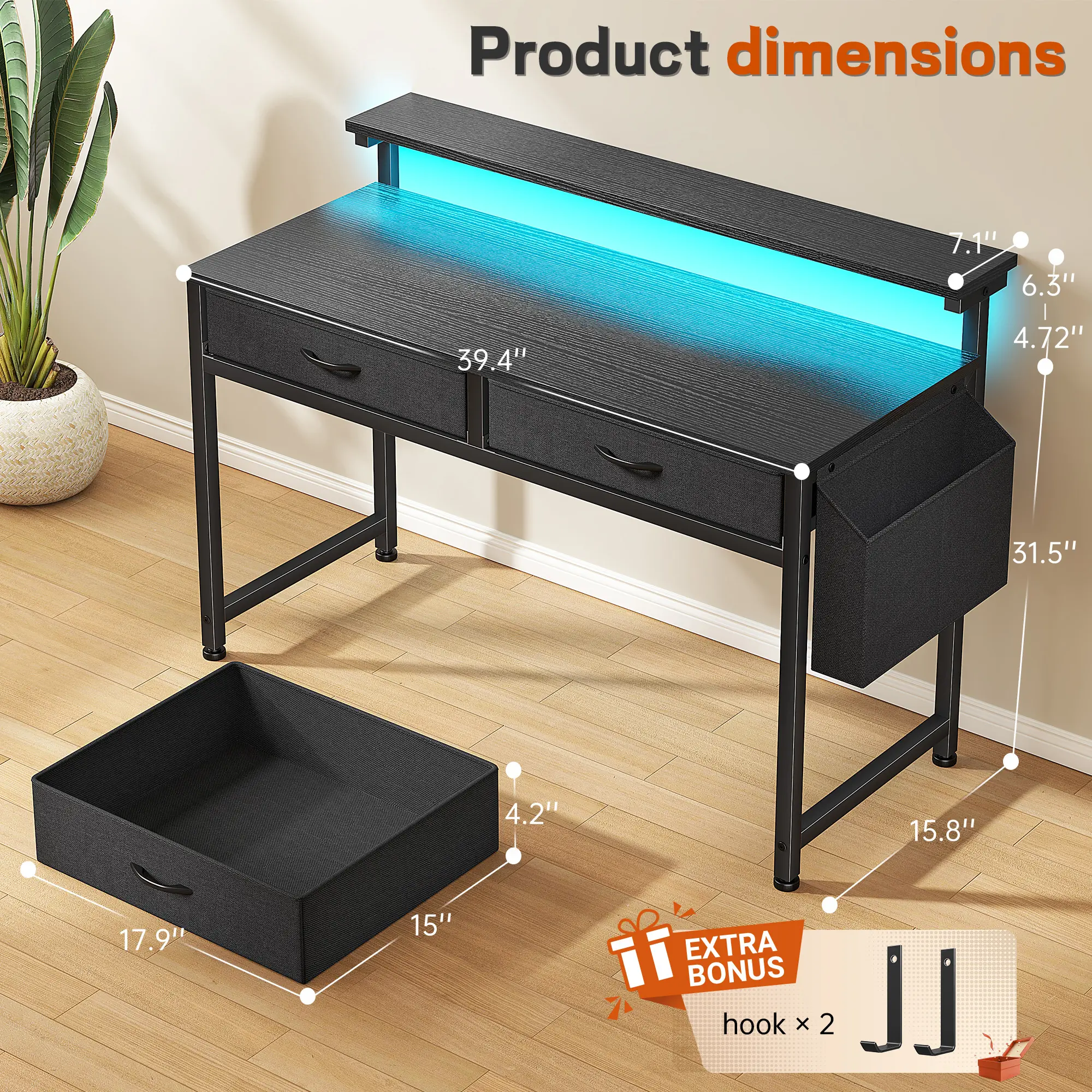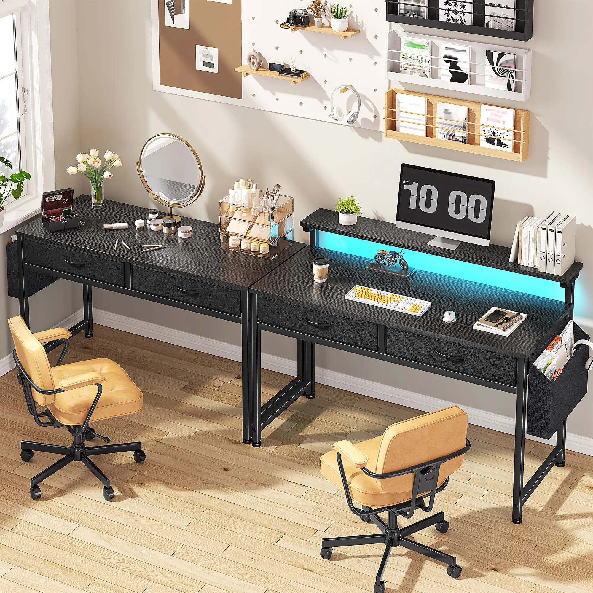 Study desk,makeup vanity , or gaming station —this sleek desk fits any room! With 2 drawers + a side pocket to keep everything organized. Perfect for dorms, apartments, or kids' rooms.