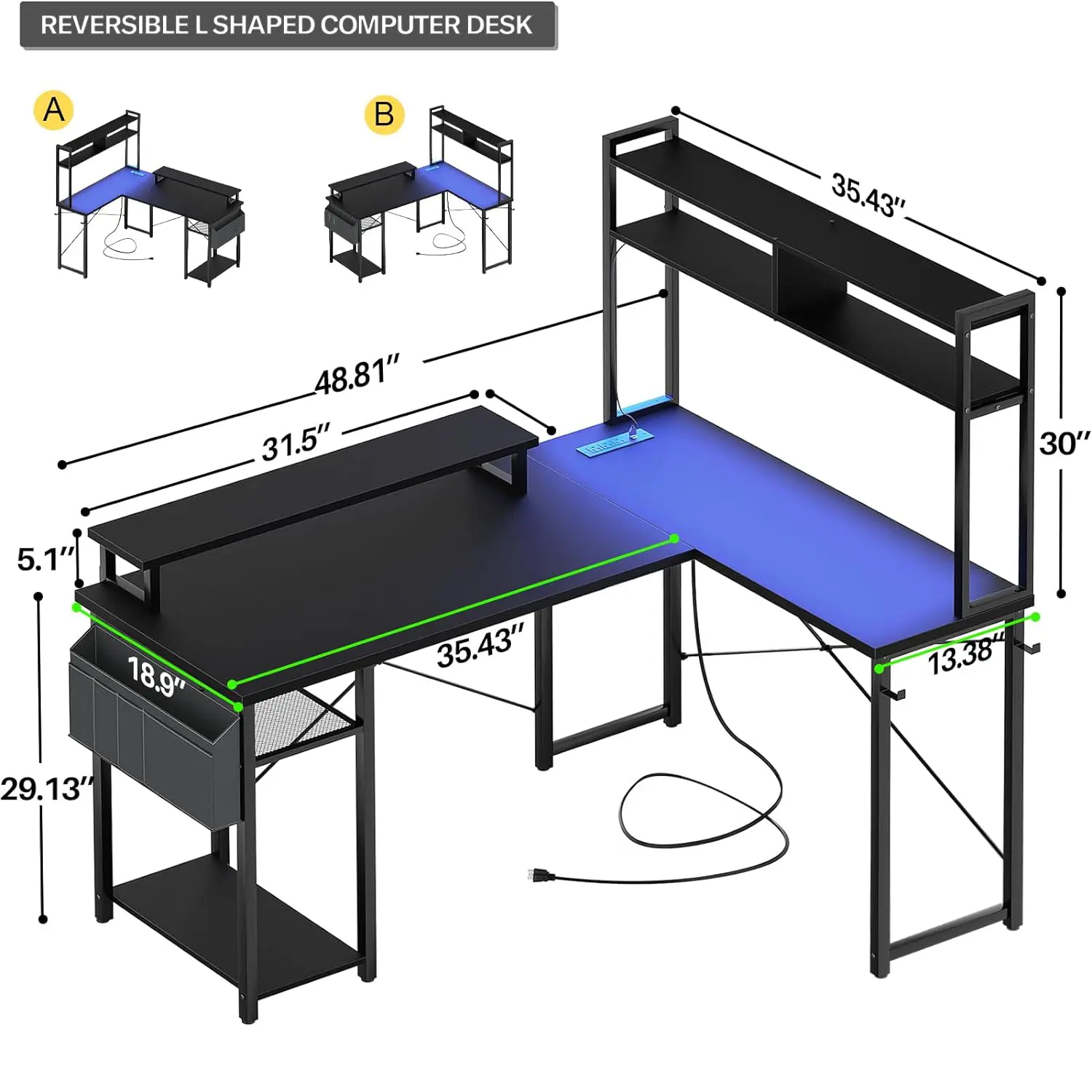 This corner desk with hutch offers a moveable monitor stand that elevates your line of sight, keeps you maintaining proper sitting posture and protect your cervical and spinal health, it could also be placed at the storage side to create a storage shelf. Extra Storage Bag and headphone hooks let you say goodbye to the mess from desktop. Dimension:18.9"D x 48.82"W x 59.13"H