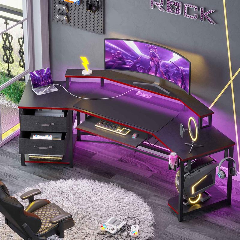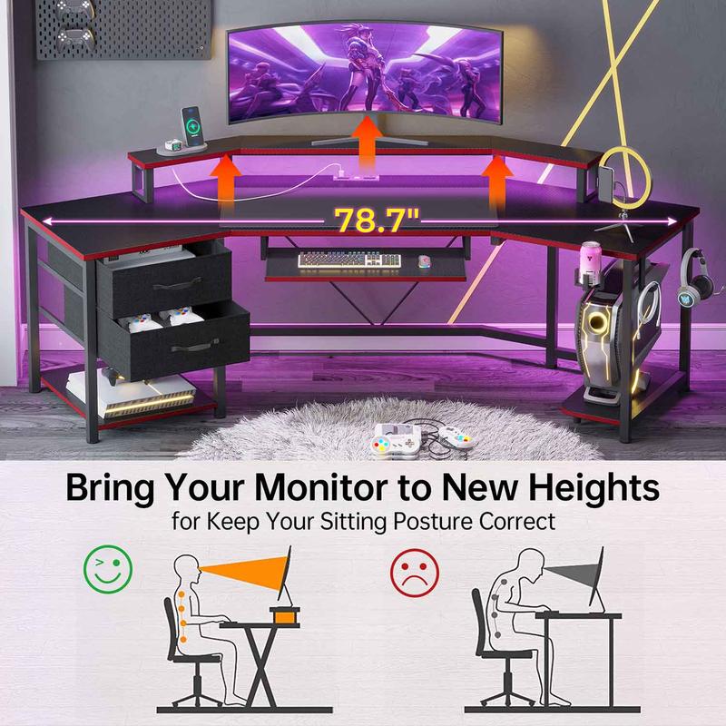 🎮 Oversized Gaming Desk SEDETA presents a 78.7"*21.7" L-shaped gaming desk. It includes 2 fabric drawers and a monitor shelf for 3 monitors. The LED light strip is versatile and installable anywhere. Perfect for home office or gamer use.