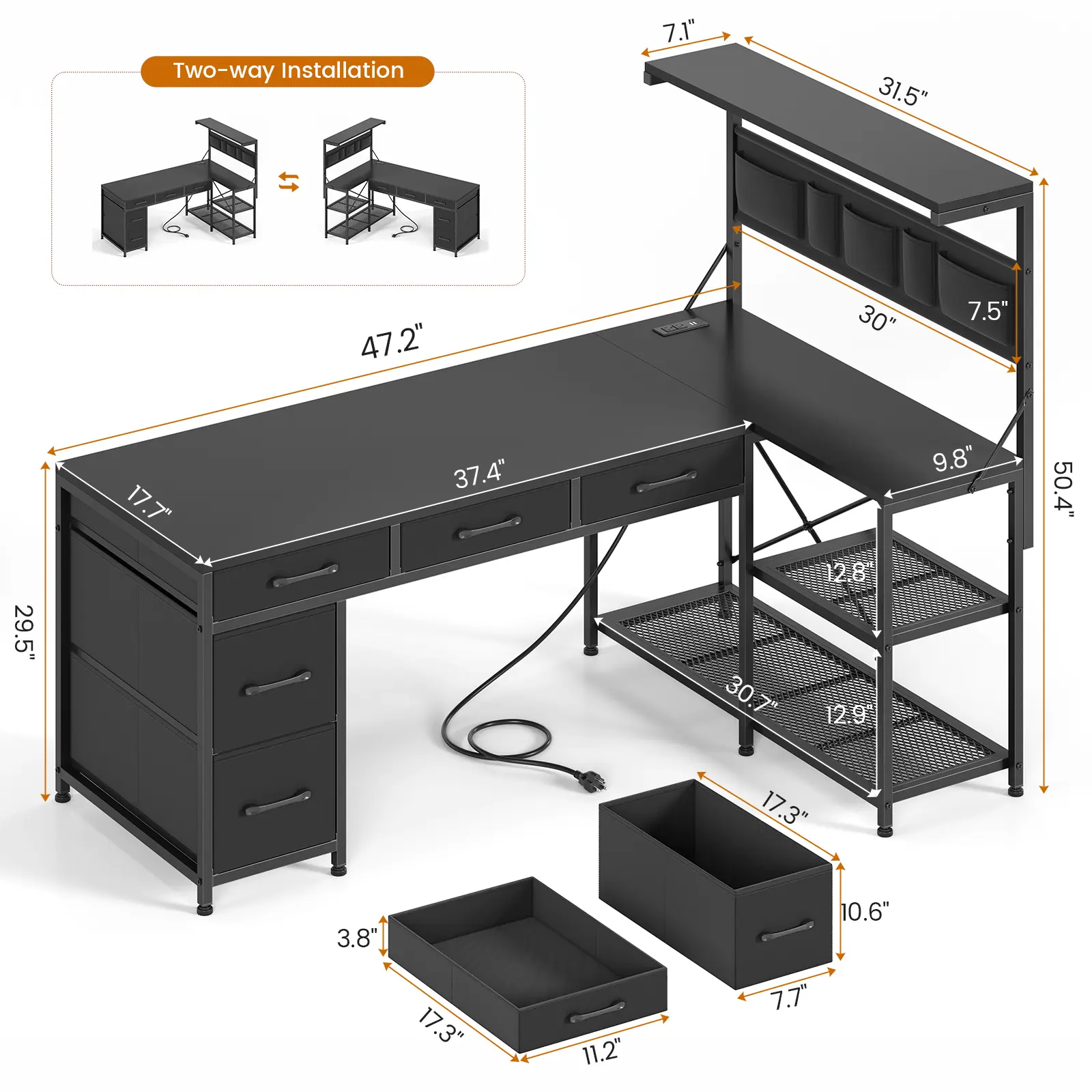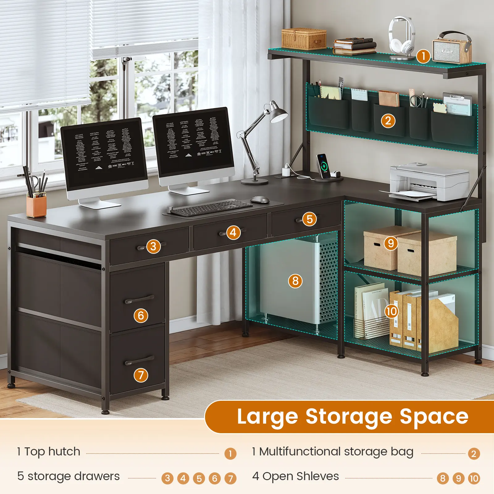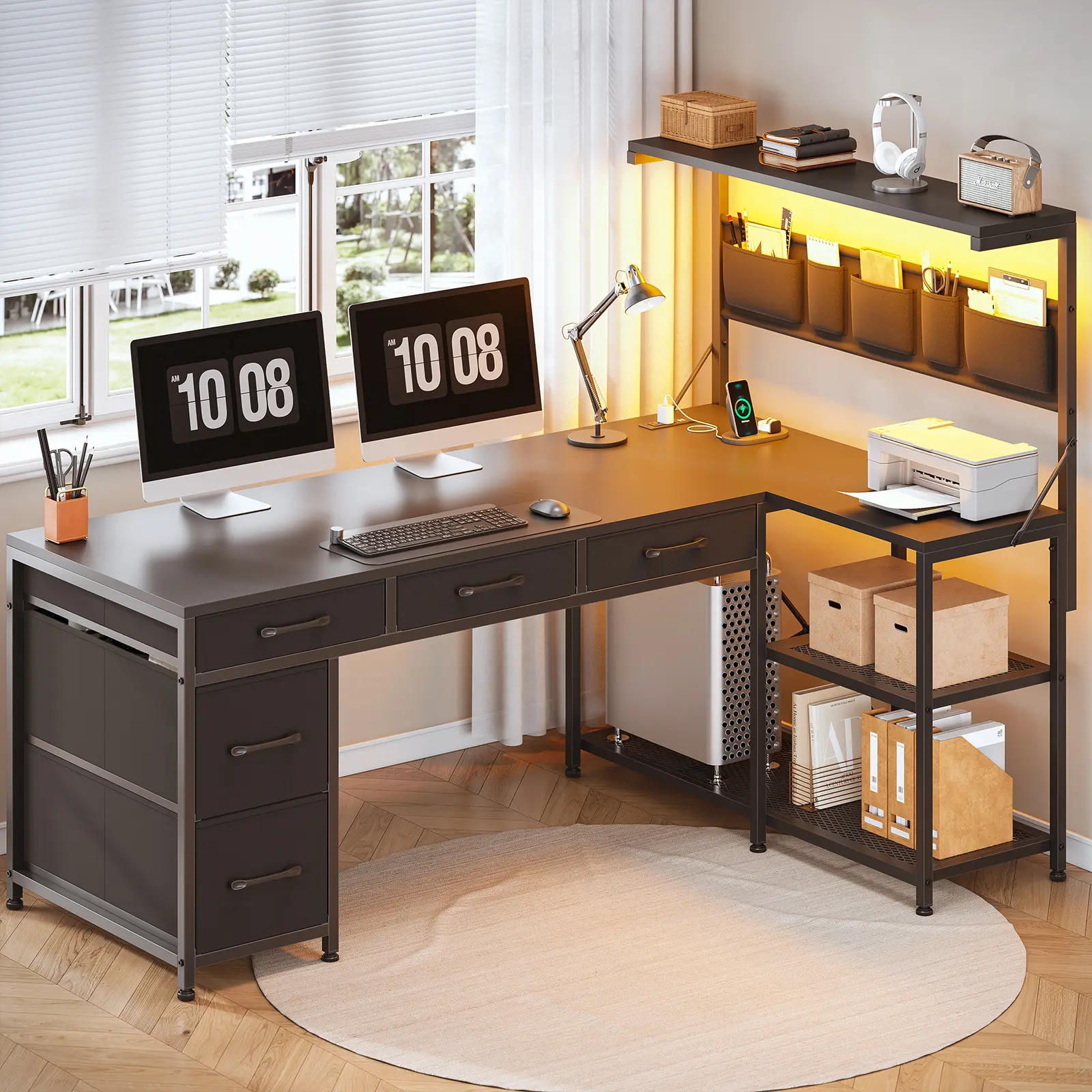 【Corner Computer Desk】Create a versatile workstation that’ll meet all your needs with this all-in-one corner gaming desk with 5 drawers, storage shelves, power outlet and LED lights, CPU Stand. Product L*W*H(cm)120*45*128