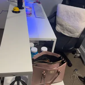 I love this table for storage, charging station, led lights 😍 #table #tabletop #desk #setup #desksetup #pcsetup