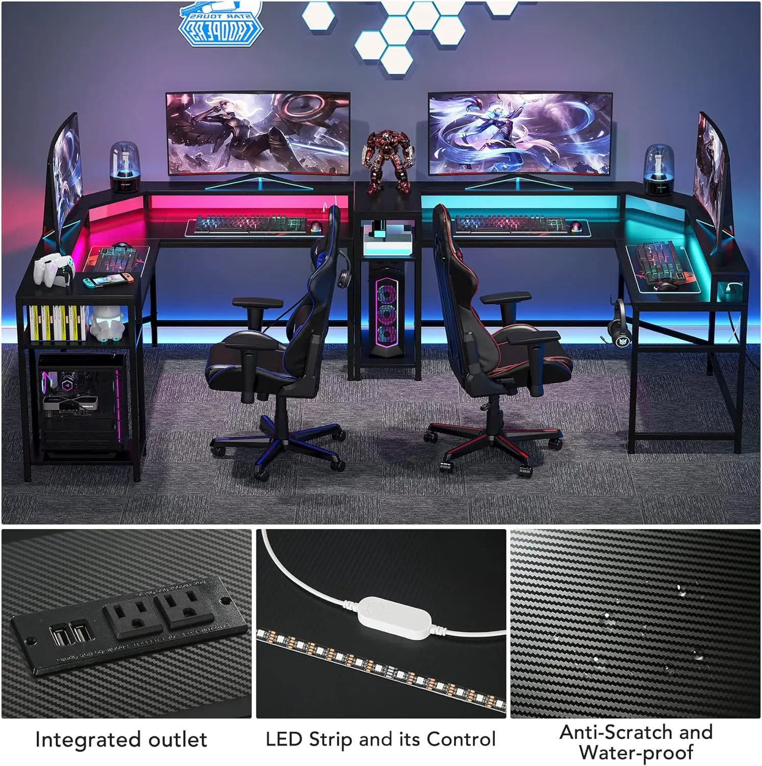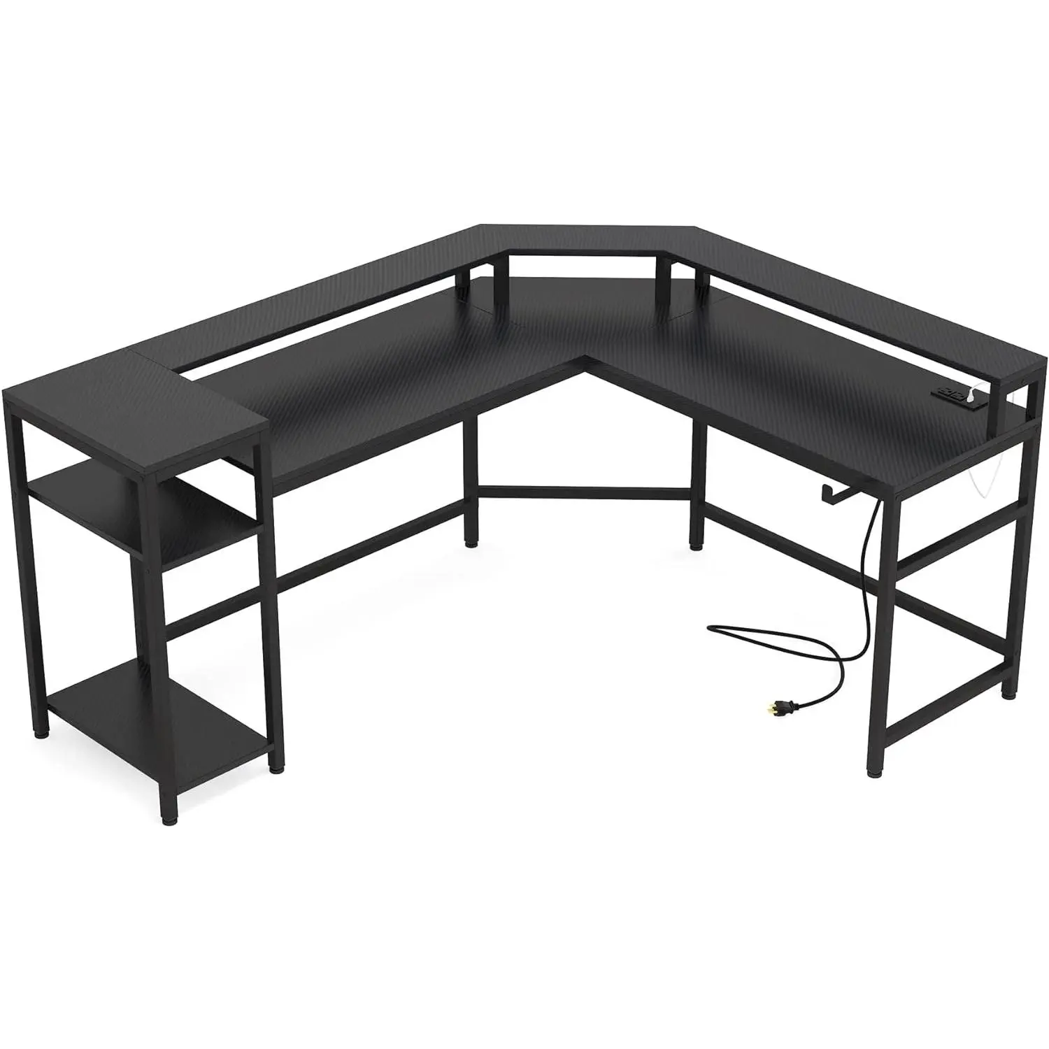 Designed for excellent gameplay, this desk features a smooth table board that seamlessly blends into any dark room. The LED strips under the heightened shelf create an immersive atmosphere, and the power outlet allows for easy equipment charging. With its large desktop and monitor stand, this gaming desk provides ample space for working or playing video games. The storage shelves units keep your essentials organized.