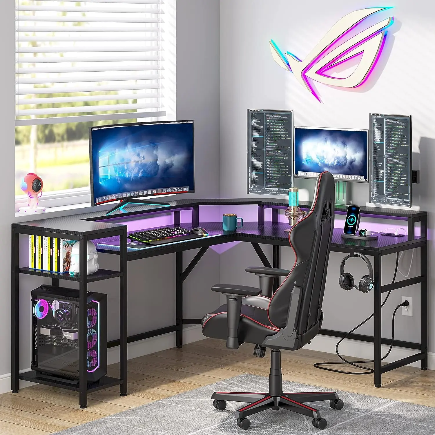 ·Big Work Station & Storage Shelves: Large desktop and monitor stand.